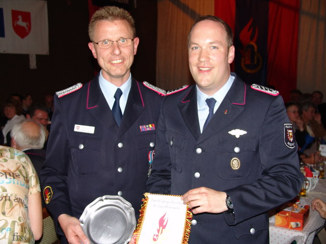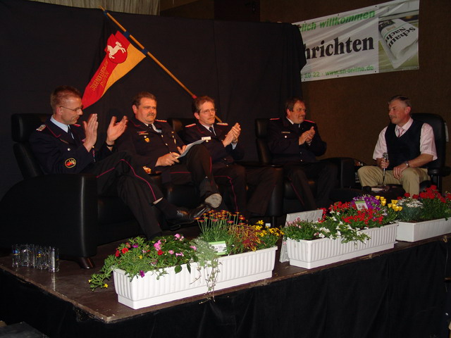 75 Jahre Freiwillige Feuerwehr und 40 Jahre Jugendfeuerwehr Riepen. 115 Gründe, um ausgiebig zu feiern. So will man es auch tun, im Bad Nenndorfer Stadtteil Riepen. Den Auftakt bildete ein Kommers mit etwa 170 geladenen Gästen in der Mehrzweckhalle. Nun sind Kommersabende für die Besucher häufig eher dröge. Jedoch stellte die Riepener Veranstaltung alles auf den Kopf. Es war ein Feuerwehrkommers, wie es ihn zuvor noch nie gegeben hat. ![]() Frank-Joachim Helms ließ die letzten 75 Jahre Feuerwehrgeschichte Revue passieren. Bereits vor der offiziellen Gründung im Jahre 1934 bestand ein organisiertes Feuerlöschwesen im Dorf. Alle Einwohner waren verpflichtet, im Ernstfall Hilfe zu leisten. Diese Pflichtfeuerwehr war im Vergleich zur heutigen Zeit recht dürftig ausgestattet: zwei Feuerleitern, drei Feuerhaken, zwei "Haufen Stricken", 53 Ledereimer und ein Anteil an der Feuerspritze in Beckedorf gehörten zur damaligen Ausstattung. 1934 gründeten Riepener Einwohner dann die Freiwillige Feuerwehr. Über die Kriegsjahre kam der Dienstbetrieb weitestgehend zum Erliegen. Erst im Sommer 1946 organisierte sich die Mannschaft neu und ein geregelter Dienst begann. Im Laufe der Jahre bewährte sich die Feuerwehr bei zahlreichen Brand- und Hochwassereinsätzen. 1970 schaffte die Gemeinde Riepen das erste Feuerwehrfahrzeug, einen Ford Transit, an. Dieses Gefährt war bis 1996 im Dienst und wurde durch ein neues Tragkraftspritzenfahrzeug ersetzt. Jugendfeuerwehrwart Bastian Breves berichtete über die letzten vier Jahrzehnte seiner Jugendabteilung. Als die Riepener Feuerwehr Nachwuchssorgen plagten, entschloss man sich 1969 eine Jugendfeuerwehr zu gründen. Dieses erwies sich als wichtiger Schritt in die richtige Richtung. Ohne vernünftige Jugendarbeit ist der Fortbestand der freiwilligen Feuerwehren gefährdet. Außerdem erweist sich die Jugendfeuerwehr auch als Helfer in allen Lebenslagen. Das Dienstbuch aus dem Jahr 1984 berichtet von einem Dienstabend, an dem die Mathehausaufgaben eines Mitglieds gelöst werden sollten. "Ein sinnvolles Ergebnis konnte nicht ermittelt werden", lautete der abschließende Kommentar. Moderator Wille führte die Gäste nach dem Ausflug in die Geschichte zum ersten Höhepunkt des Abends. Die Rot-Weiße-Garde des Karnevalsvereins Apelern zog den Beginn der fünften Jahreszeit mehr als ein halbes Jahr vor und überraschte die Anwesenden mit einer schwungvollen Tanzdarbietung. Fehlen durften auch nicht die Grußworte. Doch zur Überraschung aller wurden sie im Rahmen einer Talkrunde durchgeführt. Auf der Bühne nahmen die Redner aus Politik und Feuerwehr auf einem bequemen Sofa platz. Samtgemeindebürgermeister Bernd Reese musste - kaum dass er richtig saß - sogleich die erste Frage beantworten. Ob er denn wüsste, welches der Unterschied zwischen Bad Nenndorf und Riepen sei, fragte Eckhard Wille. Bernd Reese war um eine Antwort nicht verlegen, obwohl es nicht die richtige war. Wille klärte auf: "Ihr in Bad Nenndorf habt die Sterne am Himmel. Wir haben sie in der Gastronomie!". Dieser eindeutige Hinweis auf das örtliche Schmiedegasthaus, eine Sternerestaurant, sorgte für die ersten Lacher im Publikum. Locker und gut gelaunt plauderten die Gäste auf dem Sofa. Es tat ihnen auch sichtlich leid, wieder auf normalen Stühlen Platz nehmen zu müssen. Im Gespräch mit der Feuerwehr- und Jugendfeuerwehrführung aus Gemeinde und Landkreis gab es sogar noch etwas zu lernen und der Pastor der Kirchengemeinde Beckedorf stellte die Gemeinsamkeiten von Feuerwehr und Kirche heraus: Beide haben mit Geldnot und Fusionen zu kämpfen. Aber auch in ihrer Tätigkeit ergeben sich viele Gemeinsamkeiten: Jugendarbeit, ehrenamtliches Engagement für Andere und der Einsatz für eine gute Sache seien das, das Kirche und Feuerwehr gemeinsam haben. Damit dieses auch noch viele Jahre so bleibt, sprachen sich alle Redner aus Politik und Feuerwehr dafür aus, alle Feuerwehren zu erhalten und auch künftig mit einer zeitgemäßen Ausrüstung auszustatten. Mit Tanz bis in die Morgenstunden klang die Veranstaltung aus. Alle Gäste konnten dann einige Tage ausruhen, bevor am darauf folgenden Wochenende die Feier mit Zeltlager, Vorführungen, Musik und Wettbewerben weiter ging. Text und Fotos: Marco Thiele // 09.05.2009