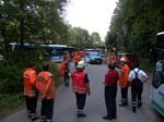 eine steile Böschung hinab und am Kanal entlang zu den bereits wartenden Bussen.