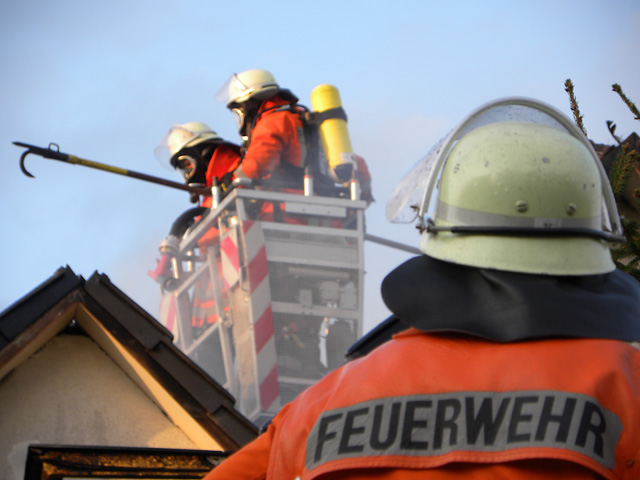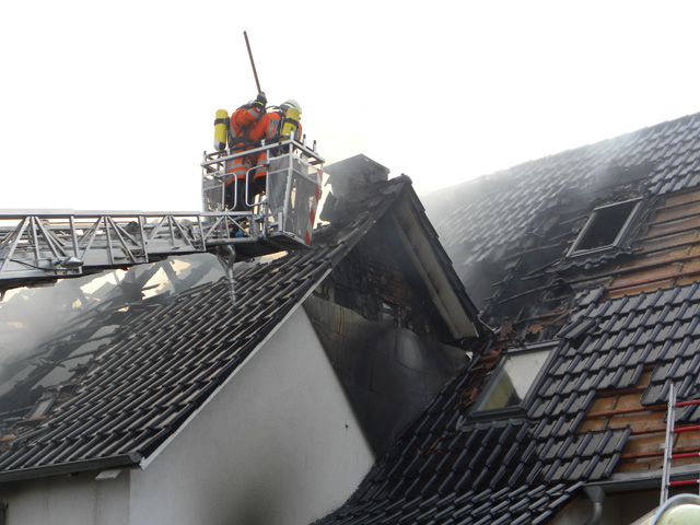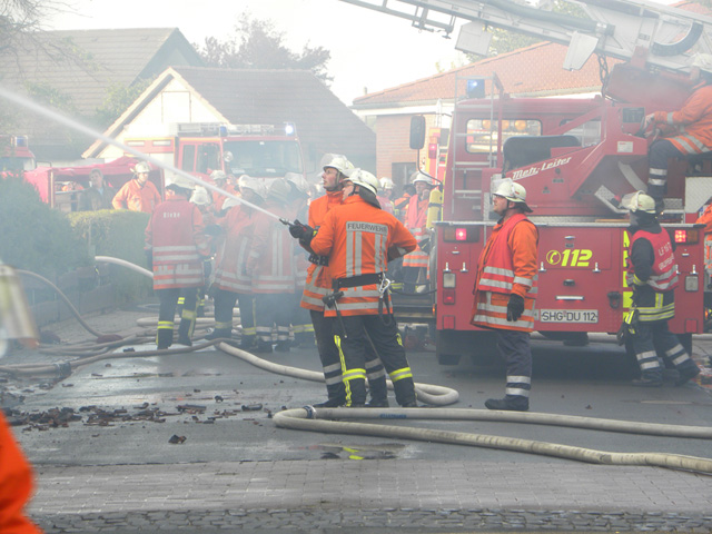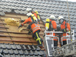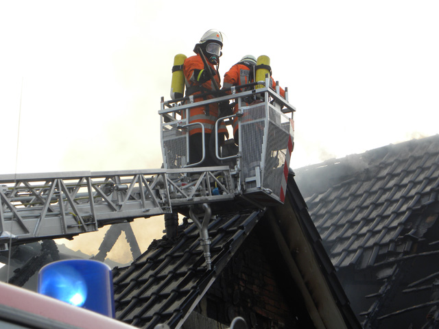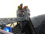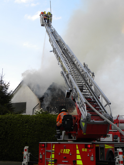 Probleme bereitete den Einsatzkräften besonders die Wasserversorgung. Es mussten lange Schlauchleitungen aus der Mitte des Ortes verlegt werden, um ausreichend Wasser an den Einsatzort zu schaffen. Gute Dienste leistete hier der Schlauchwagen aus Horsten, der mit 1000 Metern Schlauchmaterial die Wasserversorgung sicher stellte. Insgesamt nahmen die Feuerwehren sieben C- und 2 B-Rohre zur Brandbekämpfung vor. Ebenfalls im Einsatz war ein Wenderohr der Drehleiter. Die verwinkelte Bauweise des mehrfach erweiterten Hauses sorgte dafür, dass das Feuer immer wieder aufflackerte. Nachdem das Feuer unter Kontrolle war, gingen zahlreiche Trupps unter Atemschutz in das Gebäude, um die Brandnester zu löschen. Auch in der Isolierung des Daches hatten sich die Flammen ausgebreitet. Von der Drehleiter aus entfernten Einsatzkräfte die Dachziegel und öffneten mit einer speziellen Kettensäge die Holzverkleidung. Die mühseligen Nachlöscharbeiten zogen sich den ganzen Abend und die Nacht hin. Ein Übergreifen der Flammen auf die Nachbarschaft wurde verhindert. Am Gebäude selber entstanden durch das Feuer, den Brandrauch und das Löschwasser erheblicher Sachschaden. Ein Bewohner wurde leicht verletzt und in ein Krankenhaus gebracht. Da die Drehleiter aus Bad Nenndorf derzeit wegen eines technischen Defekts in der Werkstatt ist, kam den Nenndorfer Feuerwehrleuten die Drehleiter aus der Kreisstadt Stadthagen zu Hilfe. Diese fiel am späten Abend ebenfalls wegen technischer Probleme aus. Somit rückte die Feuerwehr Wunstorf mit ihrer Drehleiter nach Riehe aus. Ohne Drehleiter wären die aufwändigen Lösch- und Nachlöscharbeiten nur schwer möglich gewesen und hätten wesentlich länger gedauert. Im Einsatz waren etwa 80 Feuerwehrleute mit 19 Fahrzeugen aus den Feuerwehren Riehe, Helsinghausen/Kreuzriehe, Waltringhausen, Bad Nenndorf, Horsten, Haste, Stadthagen und Wunstorf. Dazu kamen zwei Rettungswagen und die Polizei. Die Polizei geht von einem technischen Defekt als Brandursache aus. Die Schadenshöhe liegt zwischen 150.000 und 300.000 Euro. Text und Fotos: Marco Thiele // 17.05.2010 (Update: 22.05.2010)