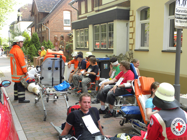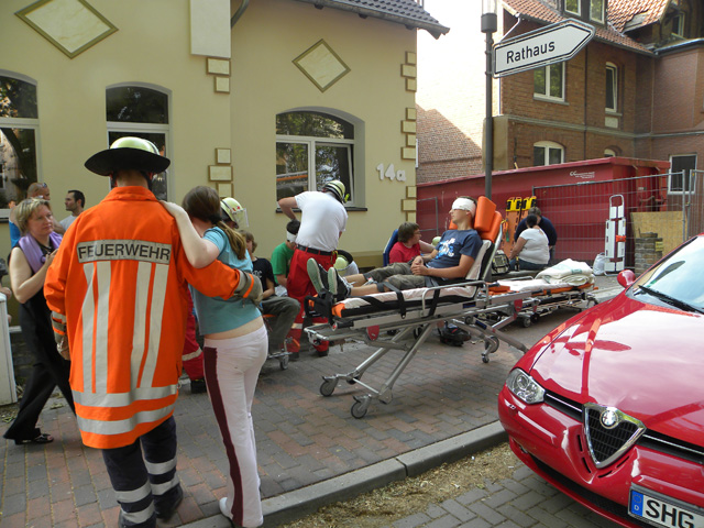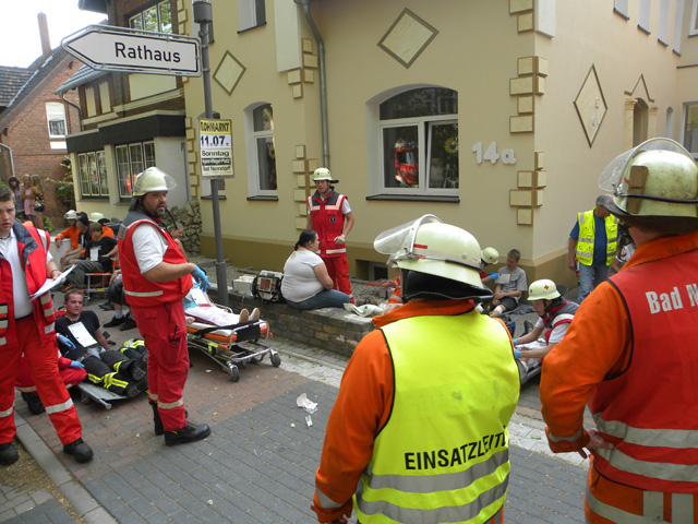 Nach dem Hubschrauberabsturz in Riepen beschäftigten sich die Feuerwehren aus der Samtgemeinde Nenndorf zusammen mit dem DRK-Einsatzzug erneut mit einer Großschadenslage. Während einer WM-Party kam es im Heizungskeller eines Hauses zu einer Verpuffung. 15 bis 20 Menschen wurden im verqualmten Gebäude vermisst. Die örtlich zuständige Feuerwehr aus Bad Nenndorf hatte es nicht weit. Der Einsatzort befand