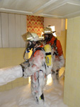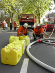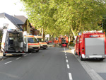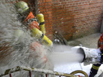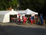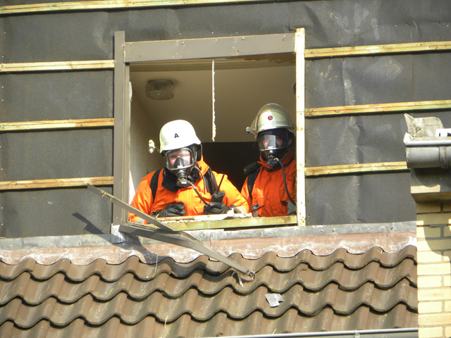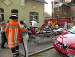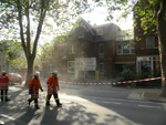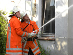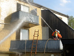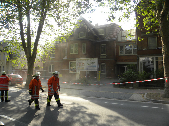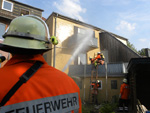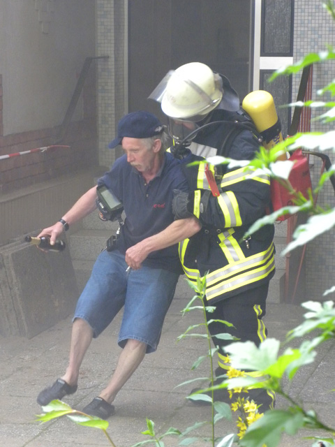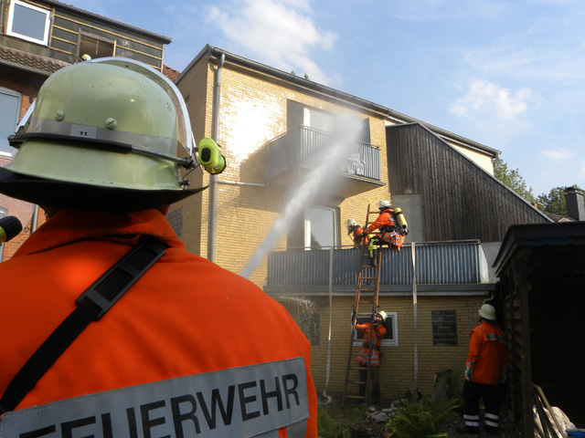 So rückten neben dem DRK auch die Feuerwehren aus Waltringhausen, Riehe, Helsinghausen/Kreuzriehe, Ohndorf, Riepen und Horsten an. Die Einsatzleitung rund um den Bad Nenndorfer Zugführer Paul Dylla bildete drei Einsatzabschnitte: Abschnitt 1 befand sich vor dem Gebäde und hatte als vornehmliche Aufgabe die Menschenrettung. Der Abschnitt 2 befand sich auf der Rückseite. Hier gingen die Feuerwehren über eine Steckleiter in das erste Obergeschoss vor. Die Aufgaben waren Menschenrettung und Brandbekämpfung. Abschnitt 3 bildete das DRK mit der Aufgabe der Verletztenbetreuung. Hierzu wurde auf der Rodenberger Allee ein Verletztensammelplatz eingerichtet. Die aus dem Haus geretteten Verletzten wurden hier von der Feuerwehr übergeben. Die Sanitäter und Rettungsassistenten des DRK registrierten die Opfer und versorgten sie. Auf dem Parkplatz hinter dem Rathaus errichteten Helfer des Einsatzzuges derweil eine Behandlungsstation. Die Geretteten wurden nach und nach vom Sammelplatz dorthin transportiert. Obwohl es sich um ein mehrfach erweitertes Haus mit sehr verwinkelten Rämen handelt, wurden die 16 Teilnehmer der WM-Party sehr schnell gefunden. So konzentrierten sich die Bemühungen nun auf die Bekämpfung des Feuers, zumal es im Dachbereich zu einer Durchzündung kam. Mit mehreren C-Rohren auf der Rückseite und dem Wenderohr von der Drehleiter konnte das Feuer sehr schnell eingedämmt werden. Im Keller des Hauses stellte ein Messtrupp in der Zwischenzeit Explosionsgefahr durch ausgelaufenes Heiöl fest. Ein einziger Funke hätte ausgereicht, eine weitere Verpuffung herbeizuführen. Der Abschnittsleiter entschloss sich daher, den Keller mit Schaum zu fluten, um diese Gefahr zu bannen. Nach etwa zwei Stunden war die Übung beendet. Das Fazit war durchaus positiv. Die gestellten Aufgaben wurden erfüllt. Lediglich sorgte ein technischer Defekt für Probleme im Sprechfunkverkehr. Beteiligt waren etwa 100 Einsatzkräfte von DRK und Feuerwehr. Text und Fotos: Marco Thiele // 08.07.2010
