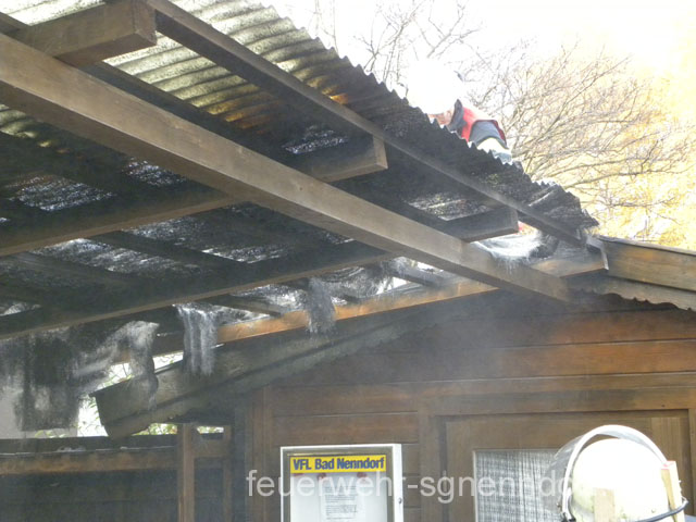 Zu einem Brandeinsatz an den Tennisplätzen in der Bahnhofstraße musste die Feuerwehr Bad Nenndorf ausrücken. In der Nähe des Hallenbades brannte das Vordach zu einem Geräteschuppen des Tennisheims. Aus bislang ungeklärter Ursache geriet das mit Kunststoffplatten gedeckte Dach eines Vorbaus in Brand. Das Feuer drohte auf ein als Gerätelager genutztes Gartenhaus