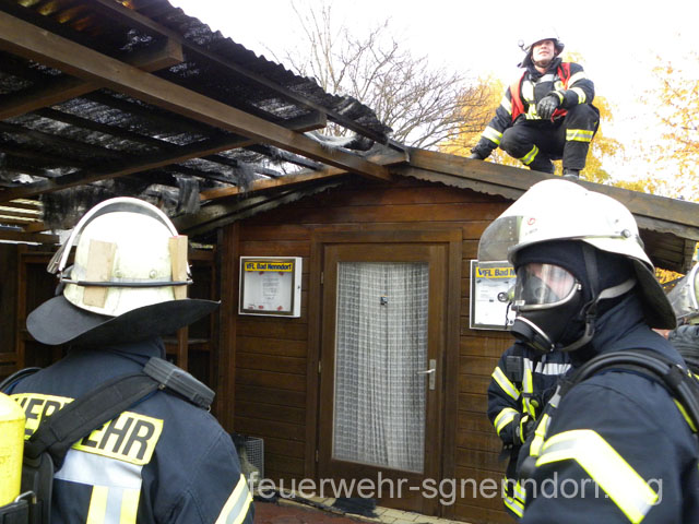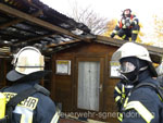 Aus bislang ungeklärter Ursache geriet das mit Kunststoffplatten gedeckte Dach eines Vorbaus in Brand. Das Feuer drohte auf ein als Gerätelager genutztes Gartenhaus