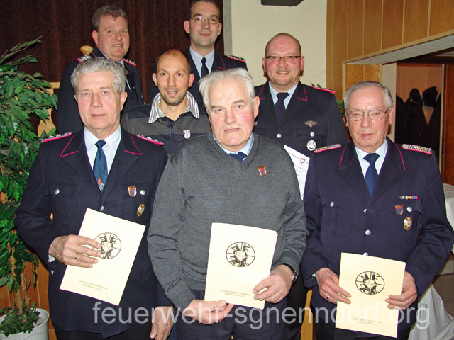 Weitere Einsätze führten die Aktiven auf die Autobahn – dort brannte ein Lkw – zu Bränden nach Riehe und weiteren Orten in der Samtgemeinde Nenndorf. Durch den in Helsinghausen stationierten Geräteanhänger Atemschutz sind die Männer und Frauen um Ortsbrandmeister Markus Brandt sehr gefragt, wenn bei Einsätzen die Atemluft knapp wird. Auch Wasser hielt die Wehr auf Trab. Beim Hochwasser im August galt es, mehrere Einsätze abzuarbeiten. Und als es im frisch renovierten Hallenbad in Bad Nenndorf zu einem Wasserschaden kam, halfen auch die Feuerwehrleute aus Helsinghausen/Kreuzriehe beim stundenlangen Auspumpen des Schwimmbeckens. Wesentlich entspannter agierten die Helfer, als im Mai eine Entenfamilie in einen Regenwasserschacht gefallen war. Nach und nach beförderten sie die niedlichen Küken wieder ans Tageslicht und entließen sie an einem sicheren Platz wieder in die Freiheit. Damit Einsätze bewältigt werden können, ist eine fortwährende Ausbildung notwendig. Daher trafen sie die aktiven Mitglieder zusätzlich zu zahlreichen theoretischen und praktischen Diensten. Besonders Augenmerk fiel auf das Training der Atemschutzgeräteträger und der Maschinisten. Wie der voll besetzte Saal im Gasthaus Hattendorf zeigte, ist die Ortswehr fest in die Dorfgemeinschaft integriert. Zusammen mit Vereinen und Organisationen aus dem Ort richtete die Feuerwehr verschiedene Veranstaltungen wie Osterfeuer und Blutspende aus. Beim Laternenumzug und der Mini-Playback-Show am Feuerwehrhaus kamen die Jüngsten dann auf ihre Kosten. Besonders auf die Jugendarbeit legt das Kommando der Ortsfeuerwehr einen großen Wert. Die prognostizierte Entwicklung in der Altersstruktur der Bevölkerung lässt einen Mangel an Einsatzkräften für die nächsten Jahre erkennen. Mit einer Kinder- und Jugendfeuerwehr arbeitet die Feuerwehr Helsinghausen/Kreuzriehe gegen diese Entwicklung an. Mit Erfolg, wie den Berichten der für die Jugendarbeit Verantwortlichen zu entnehmen war. In der Kinderfeuerwehr treffen sich 19 Kinder zwischen sechs und zehn Jahren regelmäßig, um viel über Brandschutz und Feuerwehr zu lernen. Wie die stellvertretende Leiterin Yvonne Seifert mitteilte, geschieht dieses spielerisch. Der Spaß steht bei allen Aktionen eindeutig im Vordergrund. Zusammen mit der Jugendfeuerwehr führten die Kinder Ausflüge nach Steinhude oder ein den Heide-Park durch. Neben viel Spiel und Spaß lernten die Kinder auch die Gefahren des Feuers kennen und wie sie sich im Ernstfall richtig verhalten müssen. Jugendfeuerwehrwart Dennis Feil betreute zum Jahresende acht Jugendliche. Bei den regelmäßigen Treffen stand die Feuerwehrtechnik im Vordergrund. Verschiedene theoretische und praktische Ausbildungsdienste absolvierten die drei Jungen und fünf Mädchen in 2010. Dabei wurde in Kooperation mit der Jugendfeuerwehr Waltrinhausen auch für verschiedene Wettbewerbe geübt. Beim Gemeindewettbewerb stand ein fünfter Platz zu verbuchen, beim Kreiswettbewerb leider nur ein 43. Platz. Durch drei Übernahmen aus der Kinderfeuerwehr hofft Feil, im laufenden Jahr wieder eine eigene Gruppe stellen zu können. Die Grußworte der Gäste lobten die gute Jugendarbeit der Feuerwehr. Der Suthfelder Bürgermeister Horst Schlüter dankte den Aktiven für ihr Engagement und stellte deutlich heraus, wie wichtig diese Arbeit für die Entwicklung der Kinder und Jugendlichen sei. Samtgemeindebürgermeister Bernd Reese lobte zusätzlich die Einsatzbereitschaft der Aktiven in allen Feuerwehren der Samtgemeinde. Die zehn Ortswehren werden gebraucht, um auch zukünftig bei Schadensereignissen wie dem Starkregen effektiv helfen zu können. Reese resümierte auch die Arbeit des Feuerwehrausschusses der vergangenen Jahre. Vieles habe man gemeinsam abgearbeitet. Exemplarisch nannte er die Beschaffung eines neuen Fahrzeuges für die Ortsfeuerwehr Waltringhausen. In vielen Sitzungen und Betrachtungen habe man ein Fahrzeug beschafft, das als "Standard für die Folgejahre" dienen solle. Im vergangenen Jahr bereisten die Mitglieder des Feuerwehrausschusses alle Feuerwehrhäuser. Vor Ort machten sie sich ein Bild vom Handlungsbedarf und wo Mittel eingesetzt werden müssen. Insgesamt blickt Reese optimistisch in das neue Jahr und erkennt trotz steigender Verschuldung einen Silberstreif am Horizont. Der wirtschaftliche Aufschwung macht auch vor der Samtgemeinde Nenndorf nicht halt. Mit Blick auf Baden-Württemberg, dann auch sein Schlusswort: "Wir können vieles, sogar Plattdeutsch". Im Kommando gab es eine kleine Änderung. Zum neuen Gruppenführer wählten die Aktiven Mirko Seifert. Unterstützt wird er von seiner Stellvertreterin Stefanie Refflinghaus. Langjährige Mitglieder der Feuerwehr ehrte der Leiter des Brandschutzabschnitts, Uwe Blume, mit Ehrenzeichen. Für 25-jährige Dienste im Feuerlöschwesen zeichnete er Markus Brandt und Stephan Podratzky mit dem Ehrenzeichen des Landes Niedersachsen aus. Für 25-jährige passive Mitgliedschaft erhielt Michael Pietsch eine Auszeichnung des Landesfeuerwehrverbandes. Bereits seit 50 Jahren dabei sind Willi Böttcher, Günter Hecht und Heinrich Woltmann. Über Jahrzehnte engagierten sie sich für die Feuerwehr. Viele Gründe, um sie hierfür zu ehren. Blume steckte ihnen vor der Versammlung, die sich zu ehren der Jubilare von den Plätzen erhoben hatte, die Abzeichen an und übergab die Urkunden des Landesfeuerwehrverbandes. Beförderungen durften auch nicht fehlen. Feuerwehrmänner sind nun Torsten Lorz und Michael Oberheide. Der frisch gewählte Gruppenführer Mirko Seifert stieg ebenfalls eine Stufe höher. Der stellvertretende Gemeindebrandmeister Carsten Norden beförderte ihn zum Löschmeister. Text und Fotos: Marco Thiele // 04.02.2011