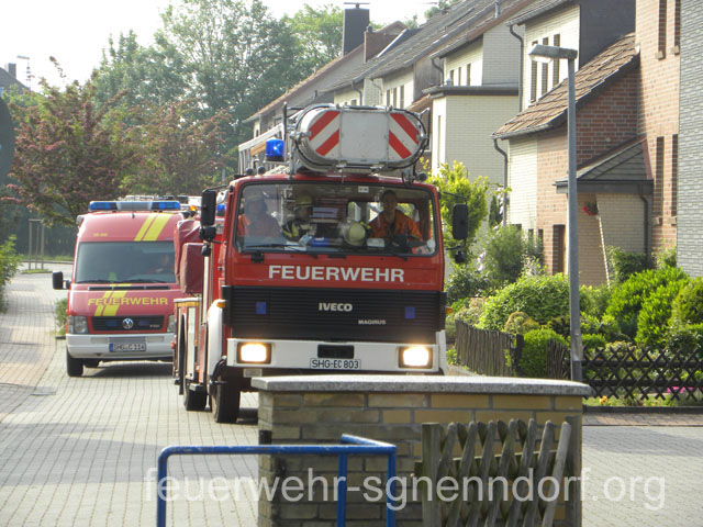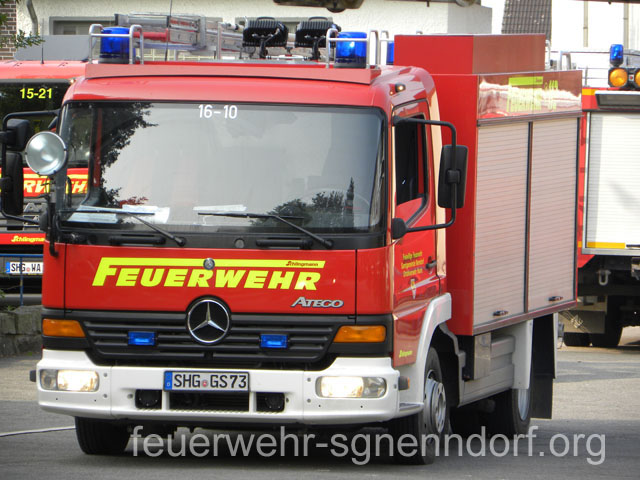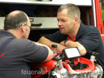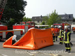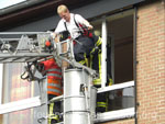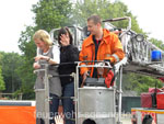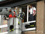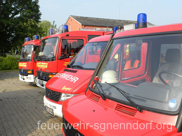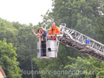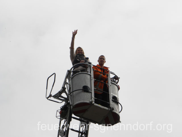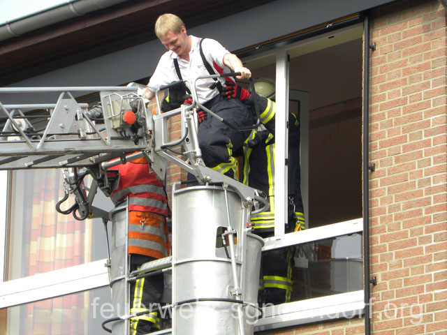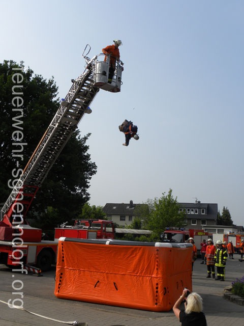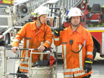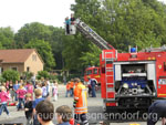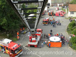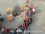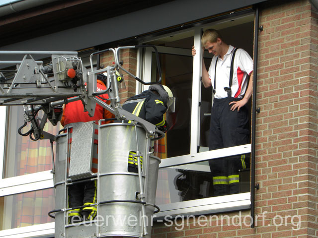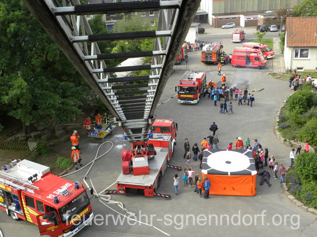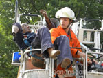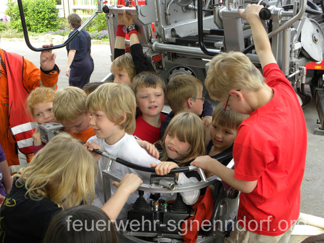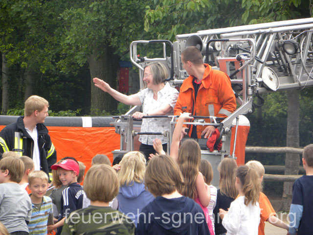 Als die Feuerwehrfahrzeuge in Position waren, kamen die Kinder näher, um die Aktionen direkt zu erleben. Als erstes rettete die Feuerwehr eine Person mit der Drehleiter aus dem ersten Stock. Als sie sicher auf dem Boden angekommen war, brandete Applaus auf. Vollkommen ungewohnt für die Feuerwehrleute, die normalerweise keine Beifallsstürme auslösen, wenn sie anrücken. Anschließend demonstrierten die Feuerwehrleute aus der Samtgemeinde Nenndorf, wie ein Sprungretter – also ein großes mit Luft gefülltes Kissen – funktioniert. Ein Dummy flog aus dem Korb der Drehleiter zielgenau und unter dem Jubel der Kinder auf das Kissen. Eine Zugabe musste sein, sodass der Dummy noch ein zweites Mal in die Tiefe stürzte. An verschiedenen Stationen lernten die Schülerinnen und Schüler dann die Feuerwehr kennen. Alles durfte angefasst und anprobiert werden. Die Kinder konnten mit Feuerlöschern ein kleines Feuer löschen, wie die Großen mit einem Strahlrohr spritzen, ihre Zielgenauigkeit an Spritzwänden testen, alle Fahrzeuge genauestens in Augenschein nehmen und vor allen Dingen jeden mit Fragen bestürmen. Das DRK Bad Nenndorf hatte einen Rettungswagen aufgefahren und demonstrierte anschaulich die Arbeit der Rettungskräfte. Die größte Begeisterung löste die Drehleiter aus Bad Nenndorf aus. Wenn die Kinder auch nicht in die Höhe durften, so doch die Lehrerinnen. Nachdem eine mutige Lehrkraft in die Luft ging, mussten auch die anderen die Schule von oben betrachten – ob sie wollten oder nicht. Unter den Anfeuerungsrufen der Kinder ging es immer wieder hinauf in den Haster Himmel. Nach etwa zwei Stunden endete der Projekttag und die Kinder gingen wieder in die Klassen. Ziele der Aktion, die auch vom Samtgemeindebürgermeister Bernd Reese beobachtet wurde, waren die Evakuierung zu proben, den Kindern die Angst vor der Feuerwehr zu nehmen und auch Werbung für die Jugend- und Kinderfeuerwehren zu betreiben. Damit die Freiwilligen Feuerwehren auch zukünftig bestehen, müssen sie schon früh auf die Kinder zugehen, um sie zu begeistern. Das hat in haste wunderbar funktioniert. Mit der Erinnerung an einen spannenden Schultag gingen die Kinder ins Wochenende. An der Aktion waren alle zehn Ortsfeuerwehren der Samtgemeinde Nenndorf, sowie das DRK aus Bad Nenndorf beteiligt. Etwa 50 ehrenamtliche Helfer, die zum Teil extra Urlaub genommen hatten, opferten ihre freie Zeit, um am Projekttag teilzunehmen. Text und Fotos: Marco Thiele // 20.05.2011