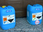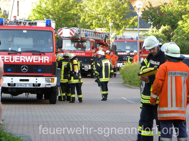 Die Feuerwehr Einsatzleitstelle in Stadthagen alarmierte daraufhin die Ortsfeuerwehr Bad Nenndorf, einen Rettungswagen des DRK und die Polizei. Vor Ort drang ein Trupp unter Atemschutz in den Keller vor, um die Flüssigkeiten zu identifizieren und den Raum zu belüften. Zur Unterstützung brachten die Feuerwehrleute einen Lüfter in Stellung, der frische Luft in das Gebäude blies. Nachdem die Stoffe identifiziert waren, barg ein weiterer Trupp die beiden blauen Kanister und brachte sie ins Freie. Nach einiger Zeit maßen die Feuerwehrleute die Chlorgaskonzentration im Keller und konnten Entwarung geben. Die Kanister wurden anschließend ordnungsgemäß entsorgt. Im Einsatz waren etwa 30 Einsatzkräfte von Feuerwehr, DRK und Polizei. Text und Fotos: Marco Thiele // 24.05.2011