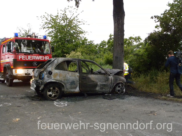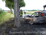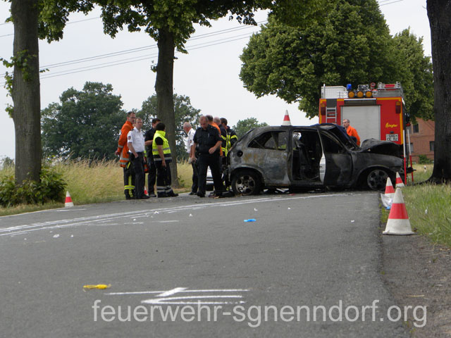 Beim Eintreffen der Feuerwehren aus Bad Nenndorf, Horsten, Ohndorf, Haste und Rodenberg stand der Pkw schon in Vollbrand und das Feuer hatte auf das trockene Gras im Straßengraben übergegriffen. Ein Trupp vom Bad Nenndorfer Tanklöschfahrzeug hatte die Flammen schnell unter Kontrolle und gelöscht. Für die Frau im Pkw kam jedoch jede Hilfe zu spät. Der Rettungsdienst kümmerte sich während der Löscharbeiten um den schwer verletzten Beifahrer. Nach der Erstversorgung im Rettungswagen flog ihn ein Rettungshubschrauber in die Medizinische Hochschule (MHH) nach Hannover. Während der Unfallaufnahme durch die Polizei sicherte die Feuerwehr die Unfallstelle ab. Im Anschluss bargen sie die Fahrerin mit hydraulischen Rettungsgeräten aus dem ausgebrannten Wrack. Nach der Reinigung der Straße rückte die Feuerwehr wieder ein. Im Einsatz waren mehr als 80 Feuerwehrleute. Dazu kamen Rettungdienst, Polizei und die Unfallforschung der MHH. Text und Fotos: Marco Thiele // 13.06.2011