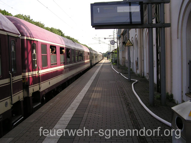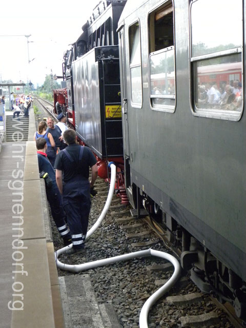 Als Wasserquelle diente ein alter Brunnen in der Nähe des Parkplatzes. Vor vielen Jahrzehnten wurde dieser schon zur Befüllung des Wasserturms genutzt, der das Wasser dann wiederum an die Dampfloks weitergab. Die Feuerwehr verlegte eine 400 Meter lange Schlauchleitung vom Brunnen über Bahnsteig von Gleis 1 bis zur Lokomotive. Als die Schläuche am eigens dafür vorgesehenen Anschluss angekuppelt waren, begann die Pumpaktion. Es galt, 22.000 Liter Wasser innerhalb von 30 Minuten in die Lok zu füllen.