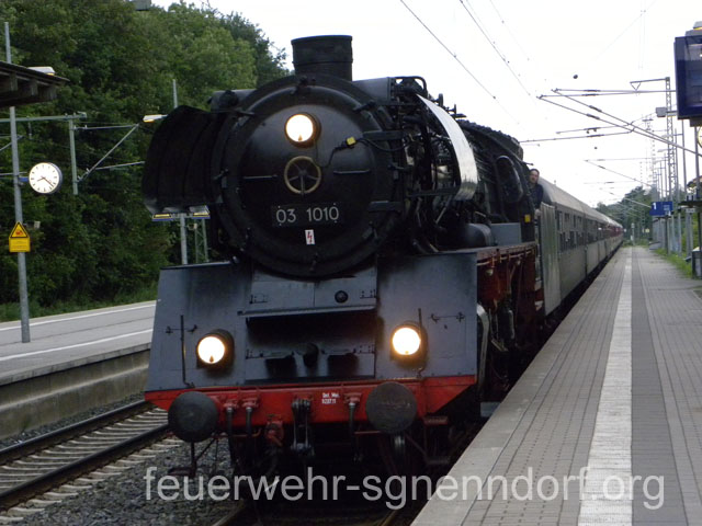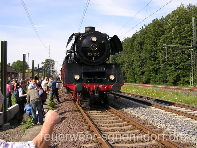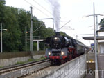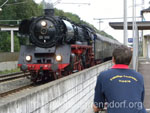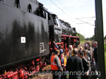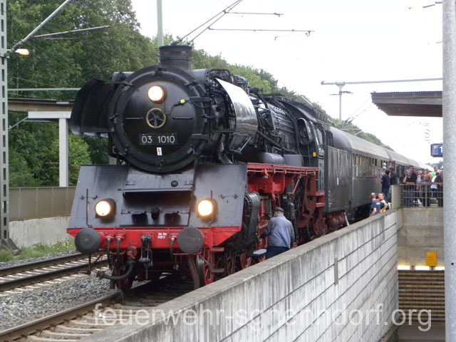 Während der Befüllung nutzten die Passagiere des Zuges die Gelegenheit, um sich die Beine zu vertreten und Fotos von der alten Lok - einer technischen Meisterleistung des letzten Jahrhunderts - zu machen. Die Lokomotive mit der Nummer 03 1010 wurde 1940 von der Firma Borsig in Hennigsdorf bei Berlin gebaut. Mit ihren etwa 1.900 PS erreicht sie eine Höchstgeschwindigkeit von 140 km/h. Dem entsprechend setzte man sie früher als Schnellzuglokomotive ein. Nach dem Befüllen des 34 Kubikmeter fassenden Wassertanks setzte die schnaufende und zischende Dampflok ihre Reise nach Goslar fort und die Feuerwehr rollte ihre Schläuche wieder ein. Abends, auf der Rückfahrt nach Menden in Nordrhein-Westfalen, machte der Zug erneut in Haste Halt, um Wasser zu fassen. Dieses Mal flossen "nur" 10.000 Liter in den Tank. Nach abgeschlossenem Tankvorgang und nachdem alle Passagiere wieder eingestiegen waren, setzte sich der Zug langsam in Bewegung. Die Fahrgäste freuten sich, dass die Feuerwehr die Weiterreise gesichert hatte und jubelten den Feuerwehrleuten während der Vorbeifahrt zu. Diese nahmen den Dank gerne entgegen und werden auch sicherlich das nächste Mal, wenn ein altes Dampfross Wasser benötigt, hilfreich zur Stelle sein. Text: Marco Thiele / Fotos: Ulrich Nürnberg (4), Marco Thiele (5) // 16.07.2011