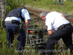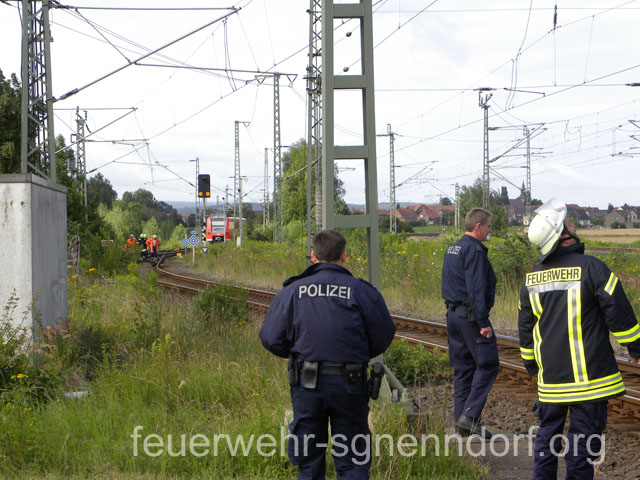 Nach dem Eintreffen von Bundespolizei und Notfallmanger der Bahn übergab die Einsatztleitung um Gemeindebrandmeister Friedhelm Möller die Einsatzstelle an den Notfallmanager. Dieser nahm dann die Erdung des betroffenen Streckenabschnitts vor und leitete weitere Maßnahmen zur Reparatur und Bergung der Bahn ein. Durch den Unfall waren auch die Bahnübergänge in Hohnhorst blockiert, da die Schranken bereits geschlossen waren. Zunächst sicherte die Polizei die Übergänge und lotste die Autofahrer um die Halbschranken herum. Später öffnete die Bahn die Übergänge wieder, sodass der Verkehr wieder flüssig fließen konnte. Die Feuerwehren waren mit etwa 50 Einsatzkräften und acht Fahrzeugen vor Ort. Dazu kamen Kräfte der ÖEL, des DRK, der Bundespolizei und der Bahn. Text und Fotos: Marco Thiele // 23.07.2011