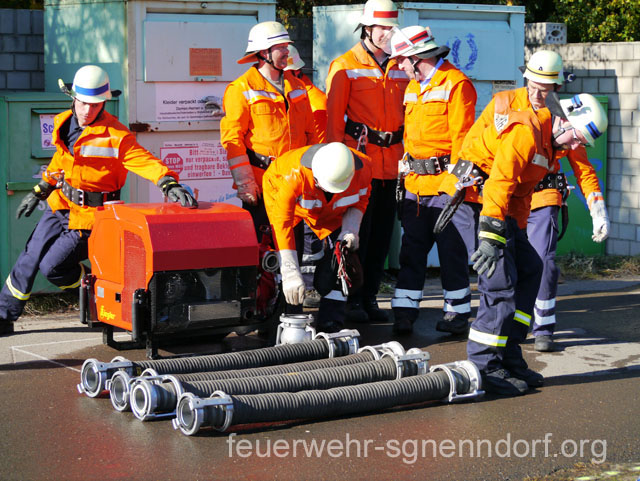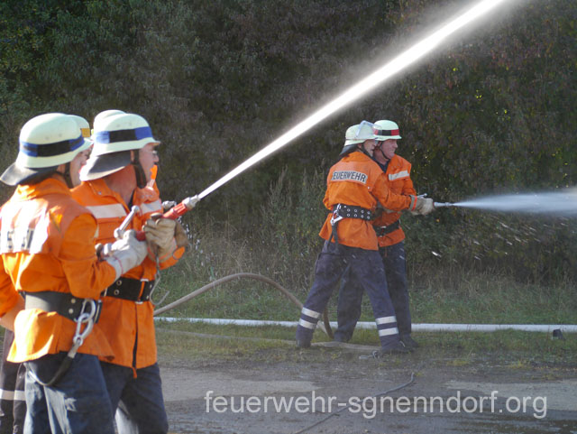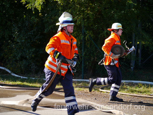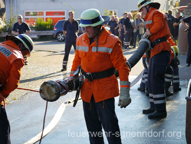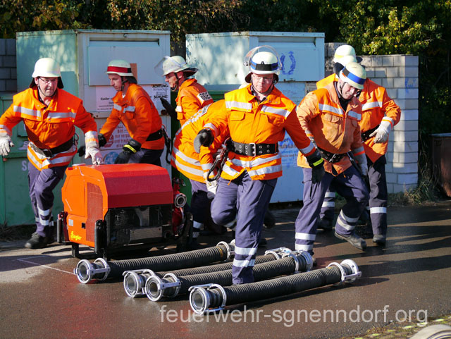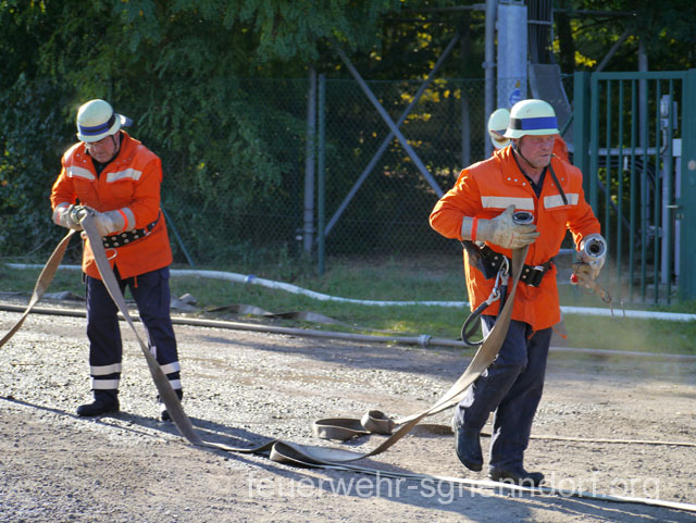 Zunächst wird die Saugleitung hergestellt, um Wasser aus einem Gewässer anzusaugen. Der Verteiler wird gesetzt und mit Warndreiecken und Schlauchbrücken sichern die Gruppenmitglieder die fiktive Einsatzstelle ab. Drei Trupps gehen anschließend vor, um das Feuer zu bekämpfen. Der Angriffstrupp muss dabei zusätzlich noch einen Schlauch auswechseln, der gemäß Annahme zuvor geplatzt war. Er hat als einziger Trupp auch zwei Eimer abzupritzen: einen vor dem Auswechslen und einen danach. Wenn alle vier Eimer am Boden liegen stoppt die Zeit und das Wettkampfgericht zieht sich zur Beratung zurück. Zusammen mit dem Gruppenführer besprechen sie die Zeiten und die Fehler. Da es sich um Wettbewerbe nach alten Bestimmungen handelt, ist der Altersdurchschnitt der Gruppen recht hoch. Die älteren Feuerwehrmitglieder nutzen die Gelegenheit der Wettbewerbe gerne, um zusammen über alte Zeiten und auch aktuelle Themen in gemütlicher Runde zu diskutieren. Aber auch jüngere Feuerwehrleute finden Gefallen an den unkomplizierten Wettbewerben, sodass sie sich immer größerer Beliebtheit erfreuen. Insgesamt gingen sechs Gruppen an den Start. Auch die Wertungsrichter mussten ihr Können zeigen und startete als siebte Gruppe. Für den Sieg reichte es jedoch nicht. Den ersten Platz belegte mit 94,0 Sekunden die Feuerwehr Riehe. Gefolgt vom Wettkampfgericht (101,4 Sekunden) und den Feuerwehren Horsten und Rehren (jeweils 106,0). Auf den weiteren Plätzen dann die Feuerwehren Ohndorf (108,6), Haste (112,4) und Hohnhorst (114,3). Text und Fotos: Marco Thiele // 01.10.2011 (Update: 03.10.2011)