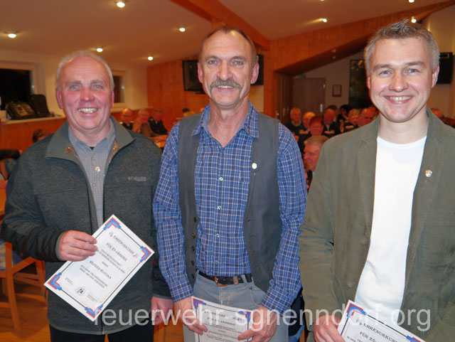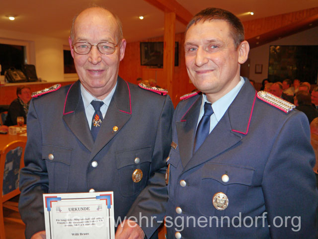 Ortsbrandmeister Oliver Schwab war dann auch erfreut über die gute Nachricht. Für den Betrieb einer Feuerwehr, mit gut aufgestellter Jugendfeuerwehr und aktive Gruppe, sind ordentliche sanitäre Anlagen unerlässlich. Die elf Mitglieder der Jugendfeuerwehr waren im abgelaufenen Jahr sehr aktiv. Viele gemeinschaftliche Aktivitäten, wie Wettbewerbe, Sport und Spiel, aber auch theoretische Dienste zur Feuerwehrthemen standen in 2011 auf dem Dienstplan. Höhepunkt, so Jugendfeuerwehrwartin Silke Wilkening, war das Kreiszeltlager in Bückeburg. Eine Woche lang zeltete man zusammen mit mehr als Eintausend weiteren Jugendlichen auf den fürstlichen Hofwiesen. Bei den Aktiven stand die Zusammenarbeit mit den Nachbarwehren aus Haste und Hohnhorst im Vordergrund. Gemeinsame Dienste sollen im Ernstfall dafür sorgen schneller und effektiver zu arbeiten. Als im Sommer in der Feldmark ein Traktor brannte, zeigten sich die Früchte dieser Zusammenarbeit. Gemeinsam brachten die Feuerwehrleute das Feuer unter Kontrolle. Gruppenführer Michael Wehner berichtete von 48 Diensten. Verschiedenste Themen, wie Gerätekunde, Fahrzeugkunde, Retten und Selbstretten, Technische Hilfeleistung oder gefährliche Stoffe sprachen die Aktiven in der Theorie durch und setzten es praktisch um. Auch an Wettbewerben nach neuen und alten Richtlinien nahmen die Feuerwehrleute teil und selbstverständlich unterstützten sie ihre Jugendfeuerwehr beim Auf- und Abbau des Zeltlagers. Dass es sich bei der Feuerwehr um ein wichtiges Standbein der Dorfgemeinschaft handelt, ging aus dem Bericht des Ortsbrandmeisters hervor. In Rehren finden gerade die Planungen für die Dorferneuerung statt. Damit diese nicht unkoordiniert erfolgen, gründeten die Rehrener im Mai einen Dorfverein. Die Feuerwehr arbeitet in diesem engagiert mit und bringt sich aktiv ein. Wie in jedem Jahr richtete die Feuerwehr das Osterfeuer aus und unterstützte das alljährliche Erntefest tatkräftig. Das Projekt Kinderfeuerwehr wurde in Rehren erst einmal eingestellt. Es meldeten sich zu wenige Kinder, die an den regelmäßigen Treffen teilnehmen wollten. Dennoch sollen Interessenten nicht abgewiesen werden. Zusammen mit der Ohndorfer Kinderfeuerwehr sollen Jungen und Mädchen für die Feuerwehr begeistert werden. Aus der Jugendfeuerwehr in die Einsatzabteilung wechselte Thorben Bock. Da er den ersten Teil seiner Grundausbildung bereits erfolgreich abgeschlossen hat, beförderte ihn der Ortsbrandmeister zum Feuerwehrmann. Sichtlich überrascht zeigte sich Achim Bock über seine Beförderung zum Ersten Hauptfeuerwehrmann. Seinen dritten Stern für die Schulterklappen erhielt er aus der Hand von Oliver Schwab. Gemeindebrandmeister Friedhelm Möller beförderte Gruppenführer Michael Wehner zum Oberlöschmeister. Für 25-jährige fördernde Mitgliedschaft ehrte Ortsbrandmeister Schwab Reinhard Grittner, Mirko Lattwesen und Wilfried Wlotzka. Als Dank und Anerkennung erhielten sie eine Anstecknadel und eine Urkunde überreicht. Bereits seit 60 Jahren dabei ist Wilfried Ahrbecker. Der langjährige Gruppenführer und Kassierer erhielt hierfür eine besondere Ehrung. Im Namen des Kreisbrandmeisters ehrte ihn der stellvertretende Leiter des Brandschutzabschnitts Nord, Joachim Muth, mit dem Ehrenzeichen des Landesfeuerwehrverbandes für 60-jährige Mitgliedschaft in der Feuerwehr. Über künftige Beitragsfreiheit freut sich Willi Bruns. Für sein langjähriges Engagement wurde er auf Beschluss des Kommandos zum Ehrenmitglied ernannt. Text und Fotos: Marco Thiele // 28.01.2012
