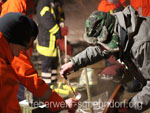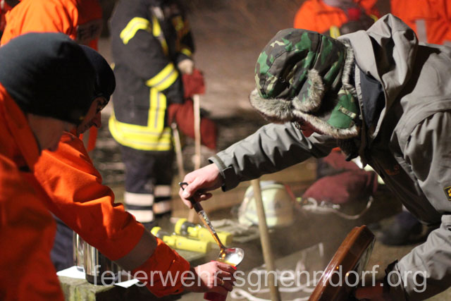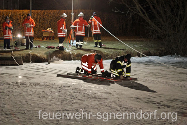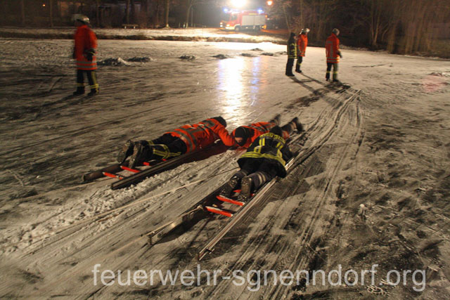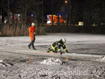 Auf Steckleiterteilen, die das Gewicht der Retter auf dem Eis verteilen, schoben sich die Helfer schnell aber vorsichtig an die eingebrochene Person heran. Bei Wassertemperaturen knapp über dem Gefrierpunkt ist eine zügige Rettung für den Eingebrochenen überlebenswichtig. Um das Risiko für die Retter so gering wie möglich zu halten, wurden sie zusätzlich mit einer Feuerwehrleine vom Ufer aus gesichert. Nach Erreichen der Einbruchstelle wurde der Eingebrochene von einem Feuerwehrmitglied aus dem Wasser gezogen und konnte sich an der Leiter festhalten. Vom Ufer aus wurden dann Retter und Geretteter zurück ans Ufer gezogen, wo der Rettungsdienst die Versorgung übernahm. Trotz der warmen Einsatzkleidung waren die Teilnehmer am Ende der Übung durchgefroren. Ein heißes Getränk aus der Thermoskanne schaffte nach erfolgreicher Rettung ein wenig Abhilfe. Text: Andreas Renner / Fotos: Andreas Renner, Mirko Seifert // 10.02.2012