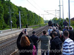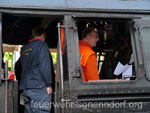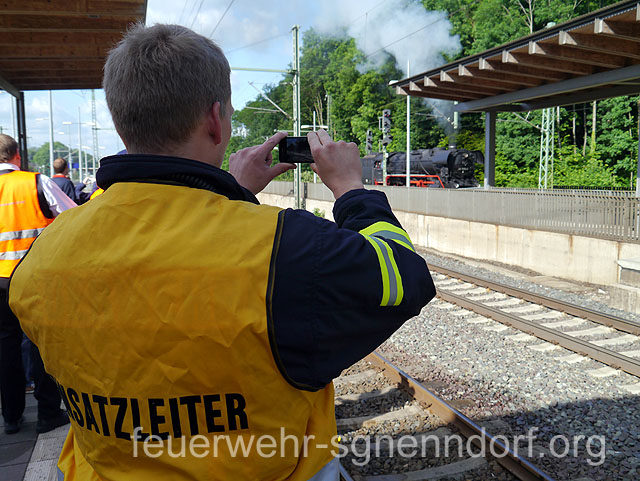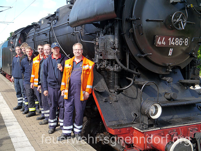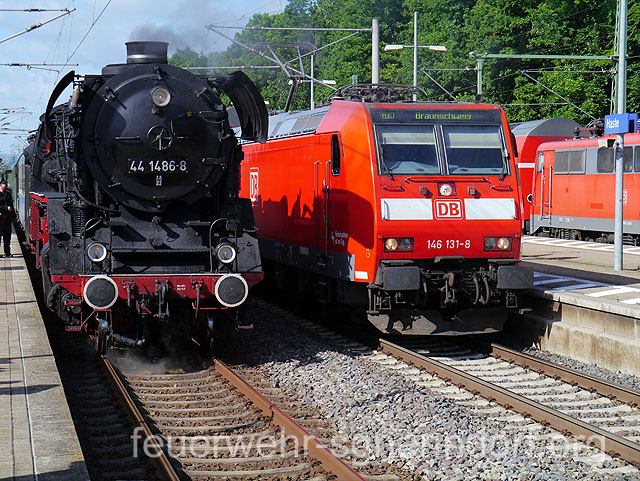 Zahlreiche Vereine kümmern sich seitdem um die alten Schätze und halten sie betriebsbereit. Allerdings wollen größere Ausfahrten gut geplant sein, da die Infrastruktur zum Betrieb der Lokomotiven größtenteils nicht mehr vorhanden ist. Neben ausreichend Brennstoff wird vor allen Dingen Wasser benötigt. Ohne die Unterstützung der Feuerwehren würden die Fahrten nicht sehr lange dauern. Denn wer könnte besser ausreichend Wasser fördern, als die freiwilligen Wehren an den Bahnstrecken. Haste bietet sich besonders an, da hier noch ein alter Brunnen existiert, aus dem schon im letzten Jahrhundert Dampfloks betankt wurden. So dauerte es nicht einmal 20 Minuten, bis 18.000 Liter Wasser in den Tank der Güterzuglokomotive der Baureihe 44 geflossen waren. Seit 1937 wurden von der Baureihe 44 insgesamt 1989 Lokomotiven produziert. Die Lokomotive 44 1486-8 mit der Fabriknummer 4728 entstammt einer Serie, die 1943 von der Firma Schneider & Cie in Le Creusot im Burgund, Frankreich, gebaut wurde. Bis 1990 war sie in der DDR bei der Deutschen Reichsbahn im Einsatz. 1993 ging sie in das Eigentum der Eisenbahnfreunde Traditionsbahnbetriebswerk Staßfurt e. V. über. Zahlreiche Schaulustige bevölkerten den Bahnsteig und machten sich ein Bild von der nahezu 70 Jahre alten Technik. Den Enthusiasmus der Älteren teilten die Jüngeren nicht immer. So manch einem Kind war das zischende und dampfende Ungetüm unheimlich. Da half auch das gute Zureden der Eltern oder Großeltern nichts. Am Abend machte die Lok dann noch einmal Station in Haste. Wieder waren die Aktiven der Feuerwehr zur Stelle um erneut einige Kubikmeter Wasser in den Tank zu füllen. Sehr zur Freude der Eisenbahnfreunde, denn ohne die Unterstützung der ehrenamtlichen Brandschützer gäbe es keine Ausfahrten der Dampflokomotiven. Text und Fotos: Marco Thiele // 09.06.2012