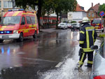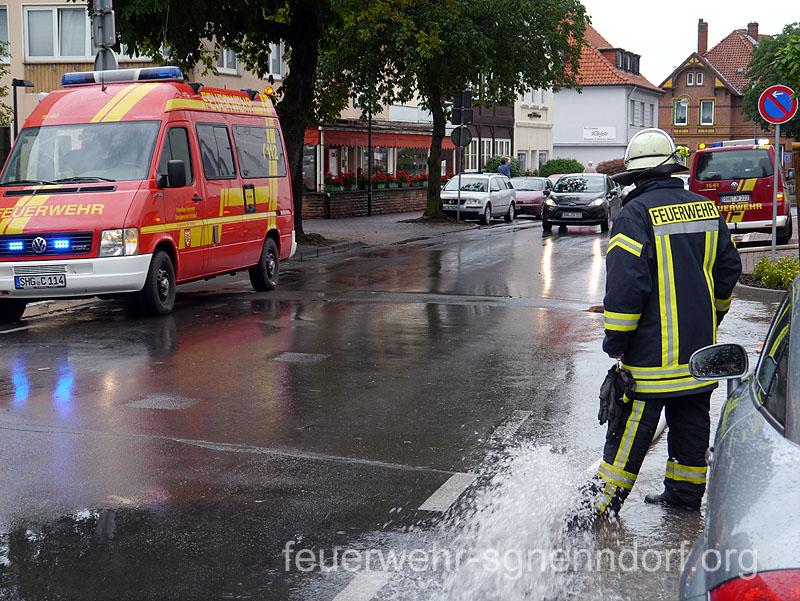 Während eines Gewitters fielen im Bereich Bad Nenndorf innerhalb kurzer Zeit mehr als 20 Liter Regen auf den Quadratmeter. Für Oberflächenentwässerung und Kanalisation kein Problem. Allerdings drückte in einigen Gebäuden das Wasser durch Lichtschächte in Wohnungen und Geschäftsräume. Die Feuerwehr Horsten rückte zu zwei Einsatzstellen aus. In der Straße Am Feldrain drang Wasser durch die Lichtschächte ein und stand schließlich 20 cm hoch im Keller. Mit einer Pumpe beförderten die Einsatzkräfte das Wasser wieder nach Außen. In Horsten selber standen in einer Tiefgarageneinfahrt etwa 10 cm Wasser und drohten, in das Gebäude zu laufen. Nach kurzer Zeit war auch hier das Wasser beseitigt.