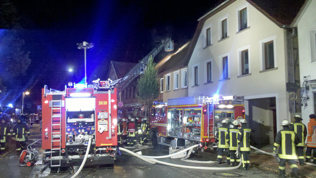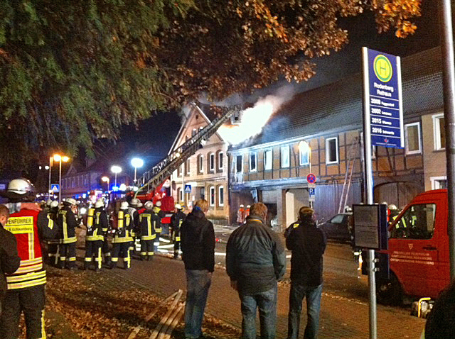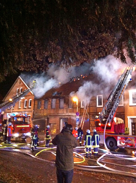 Kurz vor drei Uhr am Sonntagmorgen kam es in Rodenberg zu einem Feuer. In einem Gebäude an der Langen Straße, einer ehemaligen Gaststätte, brannte ein abgestelltes Fahrzeug. Das Feuer griff auf weitere Pkw und schließlich das Gebäude über. Vier Personen konnten das Gebäude vor dem Eintreffen der Feuerwehr verlassen, zogen sich jedoch eine Rauchvergiftung zu. Im weiteren Einsatzverlauf verletzte sich ein Feuerwehrmann und musste mit dem Verdacht auf eine Fußfraktur ins Krankenhaus gebracht werden. Da es ebenfalls aus dem Dachbereich qualmte, forderte der Einsatzleiter die Drehleiter aus Bad Nenndorf an. 30 Einsatzkräfte aus Bad Nenndorf rückten zur Einsatzstelle aus. Über die Drehleiter wurde das Dach zum Teil geöffnet, um das Feuer gezielt von oben zu bekämpfen. Nach viereinhalb Stunden konnten die ehrenamtlichen Helfer aus Bad Nenndorf wieder nach Hause fahren und den Rest des Wochenendes genießen. Einsatz 2: 29.10.2012, 03:43 Uhr, Rodenberg Knappe 24 Stunden später, in der Nacht von Sonntag auf Montag, wurde die Feuerwehr erneut zum Brandobjekt gerufen. Beim Eintreffen der Einsatzkräfte schlugen Flammen aus den Garagen, den darüber liegenden Räumen und dem gesamten Dachstuhl. Aus den Körben der Bad Nenndorfer und Stadthäger Drehleiter deckten Feuerwehrleute aufwändig das Dach ab, um an die darunter verborgenen Brandnester zu gelangen. Anschließend wurden die Einsatzkräfte aus Bad Nenndorf eingesetzt, um den Saal und andere Zimmer nach weiteren Brandnestern zu durchsuchen. Zuvor retteten Feuerwehrleute aus Rodenberg einen älteren gehbehinderten Bewohner des Nachbarhauses. Dieser war vom Rauch eingeschlossen. Über eine Steckleiter brachte ihn der Trupp aus dem Gebäude und übergab ihn dem Rettungsdienst. Kurz nach dem Mittag vierließen die mehr als 20 Nenndorfer Einsatzkräfte nach dem Wiederherstellen der Einsatzbereitschaft das heimische Feuerwehrhaus, um noch etwas Ruhe zu finden oder sich zur Arbeit zu begeben. Einsatz 3: 29.10.2012, 12:54 Uhr, Bad Nenndorf Doch kaum dass die Feuerwehrleute wieder zu Hause waren, schrillten erneut die Melder der Feuerwehrleute. Kurz vor 13 Uhr geriet ein Haufen mit Grünabfällen in Brand. Das Feuer griff auf eine Hecke und ein Gartenhaus über. Wiederum eilten mehr als 20 Feuerwehrleute zum Feuerwehrhaus und rückten zur Einsatzstelle aus. Das Feuer wurde mit zwei C-Rohren unter Kontrolle gebracht und gelöscht. Mit einer Wärmebildkamera suchten die Einsatzkräfte nach Brandnestern, bevor sie gegen 15 Uhr den Einsatzort verließen. Internetlinks: Bericht des NDR / Feuerwehr Rodenberg Text: Marco Thiele / Fotos: Simon Brandes, Eike Elwert // 29.10.2012