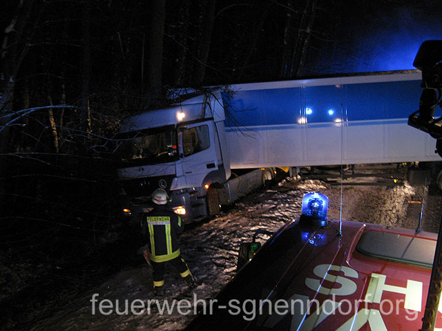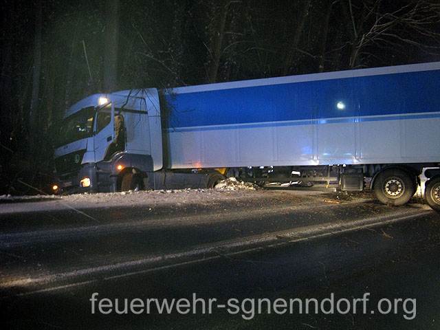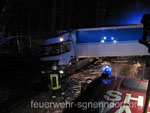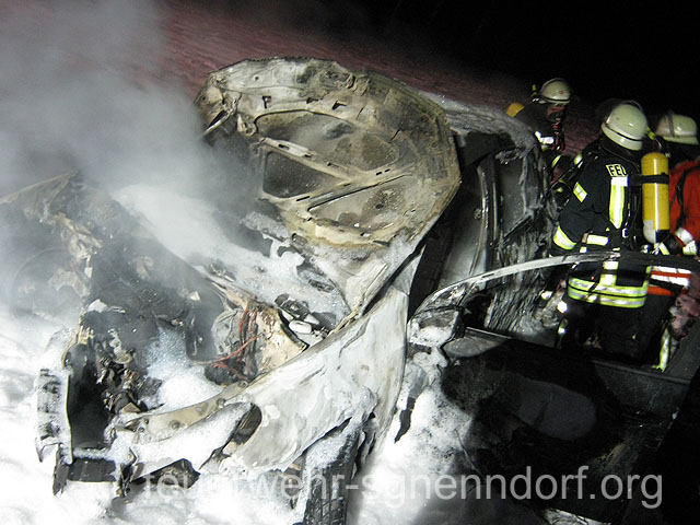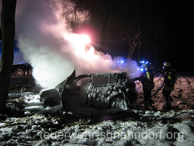 Mit dem Stichwort "Brennender Pkw nach Verkehrsunfall" alarmierte die Feuerwehr- und Rettungsleitstelle in Stadthagen um 3:58 Uhr die Feuerwehren aus Waltringhausen und Bad Nenndorf. Beim Eintreffen der ersten Kräfte stand der Lkw quer zur Fahrbahn und Betriebsstoffe liefen aus. Eine Ölsperre wurde in einem Bach aufgeschüttet, um ein Ausbreiten zu verhindern. Der Pkw stand neben der Fahrbahn im Vollbrand. Der Fahrer war nicht mehr im Fahrzeug. Mitarbeiter des Rettungsdienstes kümmerten sich bereits um ihn und brachten ihn in ein Krankenhaus.