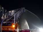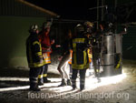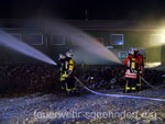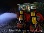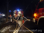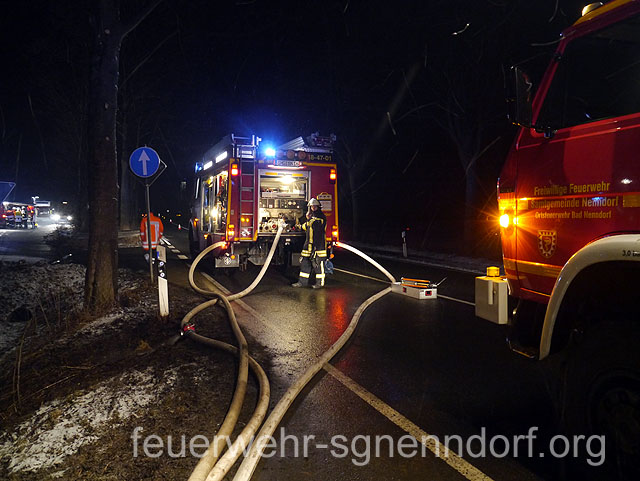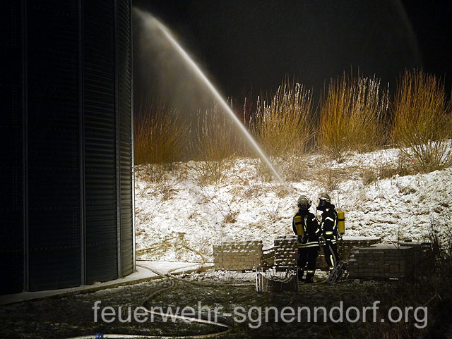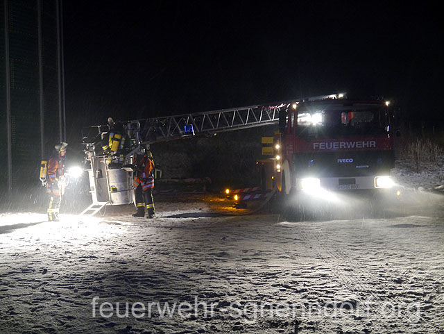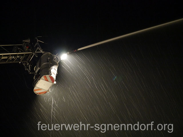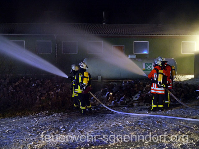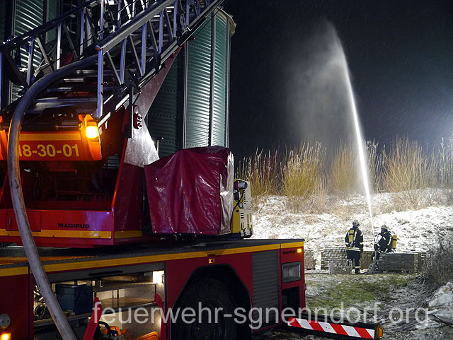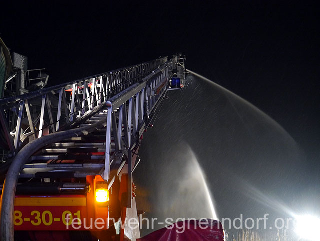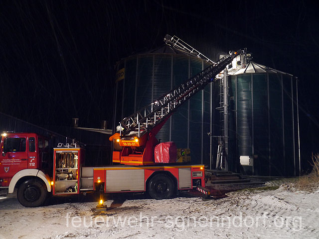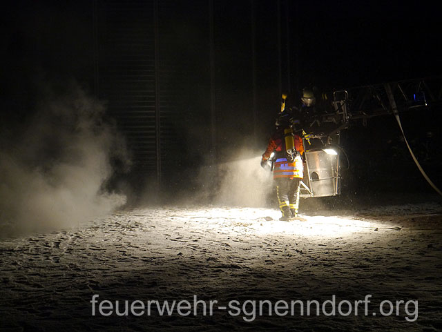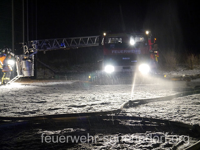 Unter der Leitung des Riepener Ortsbrandmeisters Michael Peters begann zunächst die Rettung der fünf verletzten Menschen. Die Drehleiter aus Bad Nenndorf ging in Stellung, um zwei Personen vom Dach eines Getreidesilos zu retten. Trupps unter Atemschutz suchten auf dem Gelände derweil nach weiteren Verletzten. Diese wurden zügig gefunden und den mittlerweile eingetroffenen Helfern des DRK übergeben. Nach einer Erstversorgung brachten sie zwei Krankentransporter in die Mehrzweckhalle nach Riepen, wo die Sammelstelle eingerichtet war. An der Einsatzstelle, die relativ weit entfernt von Siedlungen an der B65 liegt, mussten die Feuerwehrleute zunächst die Wasserversorgung herstellen. Dazu verlegten sie von etwa 650 Metern entfernt liegenden Teichen eine doppelte Schlauchleitung zum Stallgebäude. Insgesamt drei Tragkraftspritzen transportieren so mehr 2.000 Liter Wasser pro Minute und speisten vier C-Rohre, ein B-Rohr und das Wenderohr der Drehleiter. Einsatzleiter Michael Peters und Gemeindeausbilder Paul Dylla zeigten sich nach Abschluss der zweistündigen Übung zufrieden über den Verlauf. Die Wasserversorgung wurde zügig und schneller als erwartet hergestellt. Der im vergangenen Jahr angeschaffte neue Gerätewagen Logistik ermöglichte es, die doppelte Schlauchleitung während der Fahrt zu verlegen. Ein großes Manko waren jedoch Probleme mit der Kommunikation an der Einsatzstelle. Durch den Ausfall eines Funkkanals gab es Verständigungsprobleme. Besonders hoben beide Übungsleiter die hohe Motivation der Einsatzkräfte hervor. Bei Schneefall und Temperaturen um den Gefrierpunkt opferten sie ihre Freizeit und stellten sich den Aufgaben. In einer Nachbesprechung, an der auch die Beobachter aus anderen Wehren der Samtgemeinde teilnehmen, wird man die Übung aufarbeiten. Die Erkenntnisse fließen dann in den Einsatzplan ein, dessen praktische Umsetzung an diesem winterlichen Abend ebenfalls geprobt wurde. Im Einsatz waren die Nenndorfer Feuerwehren Riepen, Bad Nenndorf, Horsten, Ohndorf, Helsinghausen/Kreuzriehe und Algesdorf aus der Samtgemeinde Rodenberg. Sie rückten mit zwölf Fahrzeugen und 65 Feuerwehrleuten aus. Das DRK war mit drei Fahrzeugen und 15 Einsatzkräften vor Ort. Text und Fotos: Marco Thiele // 28.03.2013