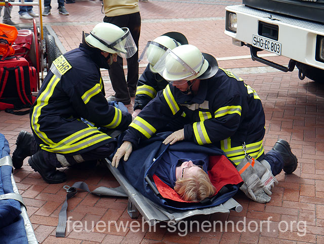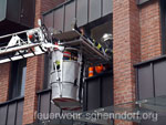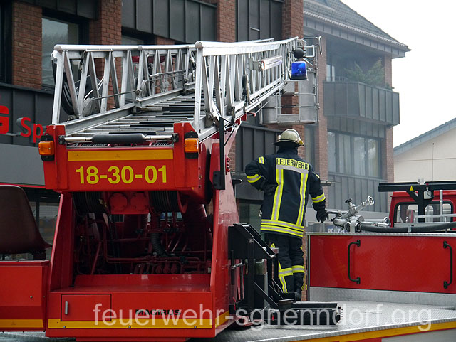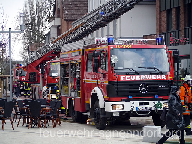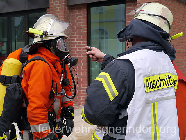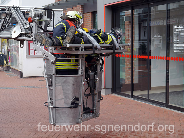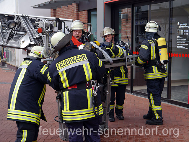 Große Aufregung herrschte am Sonnabendmittag in der Bad Nenndorfer Fußgängerzone. Aus einem Fenster über der Sparkasse drang dichter Rauch und die Feuerwehr rückte mit mehreren Fahrzeugen an. Doch was war geschehen? Glücklicherweise nur eine Übung. In einer Arztpraxis – so die Annahme – kam es zu einem Feuer im Laborbereich. Mindestens fünf Personen sollten sich in den Praxisräumen aufhalten. Die integrierte Rettungsleitstelle Schaumburg-Nienburg alarmierte daraufhin die Feuerwehren Bad Nenndorf, Riepen und Helsinghausen-Kreuzriehe.Trupps unter Atemschutz gingen sofort in das Gebäude vor, um die eingeschlossenen Personen zu retten. Für die Rettung aus dem ersten Obergeschoss wurde die Drehleiter vor dem Gebäude in Stellung gebracht. Aus den Fenstern stiegen die „Opfer“ in den Korb der Drehleiter um, der sie sicher wieder auf den Boden brachte. Parallel zur Menschenrettung bauten weitere Einsatzkräfte die Wasserversorgung aus den Fahrzeugen und aus einem Hydranten auf. Ein Lüfter beförderte zusätzlich den Rauch in das Freie. Die Feuerwehr aus Riepen unterstützte den Einsatz mit Atemschutzgeräteträgern. Ebenso die Feuerwehr Helsinghausen/Kreuzriehe, die zusätzlich ein Zelt errichtete, um die eingesetzten Trupps mit neuer Atemluft und Getränken zu versorgen. Nach etwa einer Stunde war die Übung beendet. Es folgte ein Rundgang der beteiligten Einsatzkräfte durch die Arztpraxis, die aus acht Räumen besteht. Ohne Sicht war es für die eingesetzten Trupps nicht einfach, alle Räumlichkeiten zu durchsuchen. Ein geplantes und umsichtiges Vorgehen ist erforderlich, damit eingeschlossene Personen schnell gefunden werden. Es beteiligten sich mehr als 40 ehrenamtliche Feuerwehrleute mit sechs Einsatzfahrzeugen an der Alarmübung, die vorher nicht bekannt war. Mit der Übung sollten nach der Umgestaltung der Fußgängerzone auch die Anfahrtswege und die Aufstellmöglichkeit für die Drehleiter geprüft werden. Hierbei fiel auf, dass sich einige Poller mit den Dreikantschlüsseln der Feuerwehre nicht mehr umklappen ließen. Zum Glück fuhren die Einsatzkräfte über die Kurhausstraße an. Bei der Fahrt von der anderen Seite wäre im Ernstfall wertvolle Zeit verloren gegangen. Einen besonderen Dank richteten die Einsatzkräfte an die Sparkasse Schaumburg, insbesondere den stellvertretenden Leiter der Filiale Bad Nenndorf, Matthias Mühlenhoff. Dieser hatte die leer stehenden Räume zur Verfügung gestellt und zusätzlich Getränke gespendet.