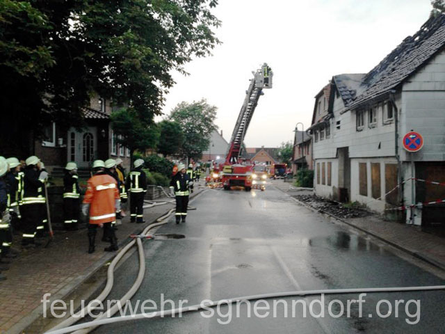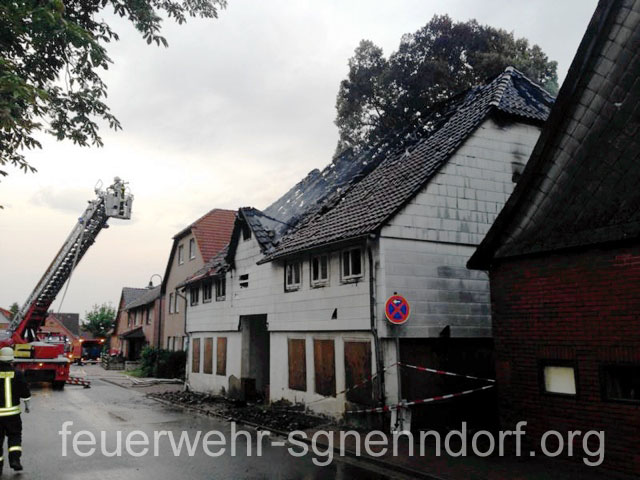 Bei einem Großbrand in einem leer stehenden Gebäude in Hattendorf kam auch die Feuerwehr Bad Nenndorf zum Einsatz. Besonders die Drehleiter wurde von der Einsatzleitung benötigt, um von oben zu löschen. Um kurz nach fünf Uhr morgens war die Nacht für die ehrenamtlichen Feuerwehrleute aus Bad Nenndorf vorbei. Die Integrierte Regionalleitstelle Nienburg/Schaumburg alarmierte die Feuerwehr zu einem Großbrand - Alarmstufe B3 - ins Auetal nach Hattendorf. Dort brannte der Dachstuhl eines leer stehenden Wohnhauses.Die Feuerwehren der Gemeinde Auetal waren bereits mit den Löscharbeiten beschäftigt und hatten das Feuer weitestgehend gelöscht. Über die Drehleiter konnten von oben gezielt Nachlöscharbeiten im einsturzgefährdeten Haus vorgenommen werden. Die Wärmebildkamera half beim Aufspüren der letzten Brandnester. Nach etwas mehr als zwei Stunden war der Einsatz für die Feuerwehrleute aus Bad Nenndorf beendet. Text: Marco Thiele / Fotos: Umweltschutzeinheit Landkreis Schaumburg // 03.08.2013