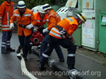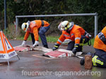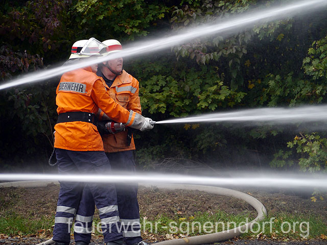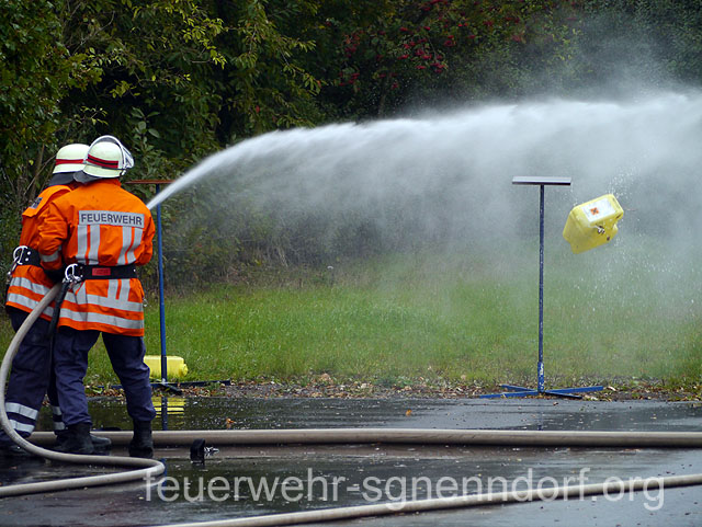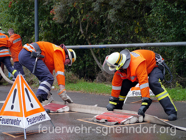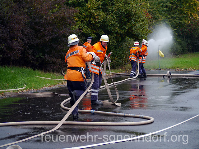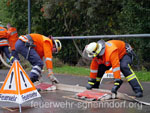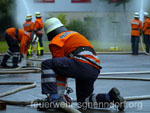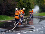 Die Gruppen erhalten die Aufgabe, so schnell und so fehlerfrei wie möglich einen Löschangriff mit drei Rohren aufzubauen. Zunächst wird die Saugleitung aufgebaut, um Wasser fördern zu können. Nach der Verkehrssicherung mit Schlauchbrücken und Warndreiecken ist der eigentliche Löschangriff in vollem Gange. Drei Rohre werden vorgenommen, um die "Eimer" mit einem gezielten Wasserstrahl von den Ständern zu befördern. Nachdem alle Ziele auf dem Boden aufgeschlagen sind, endet die Zeitnahme.