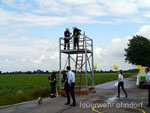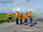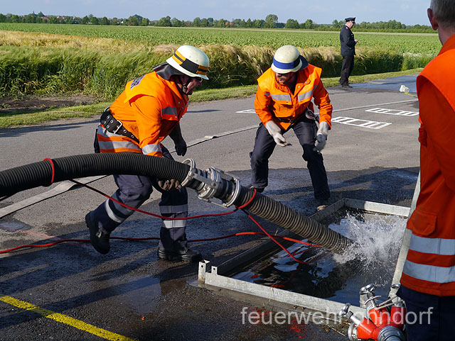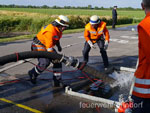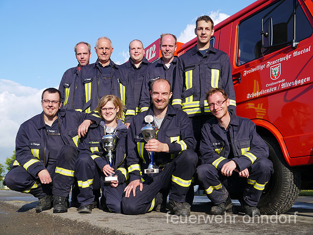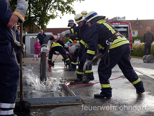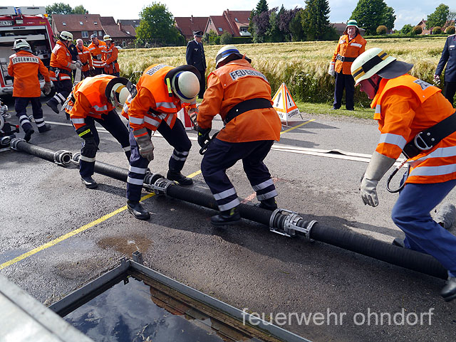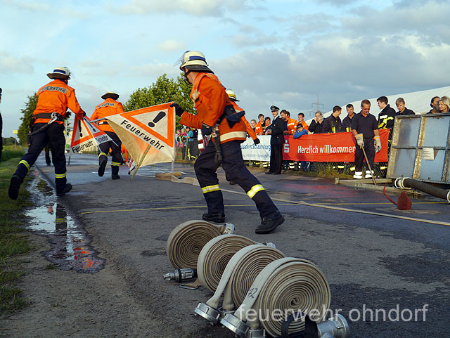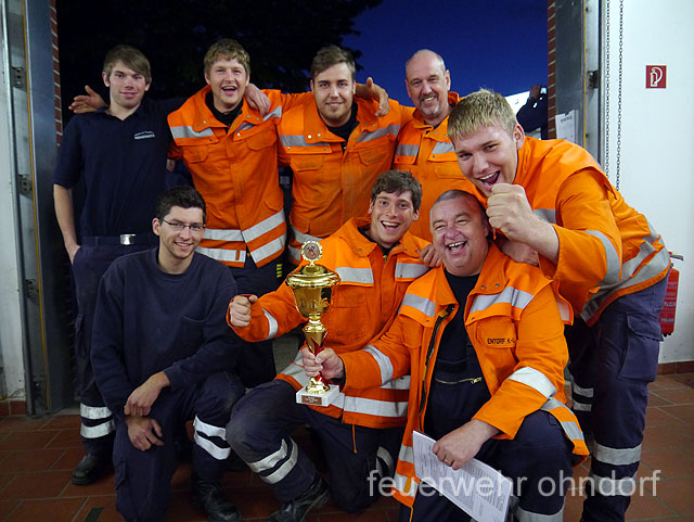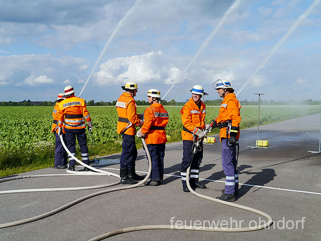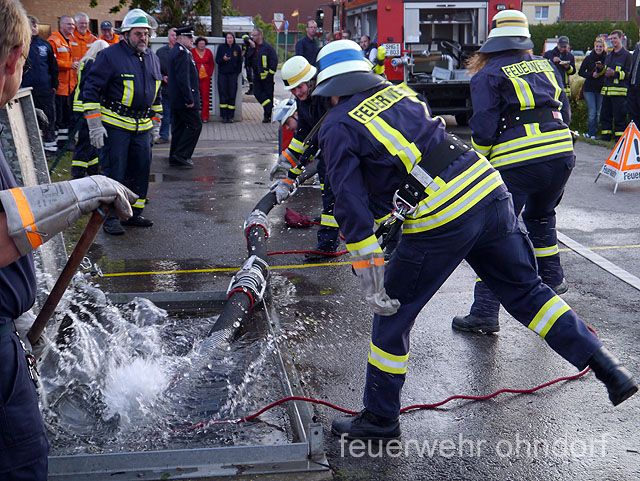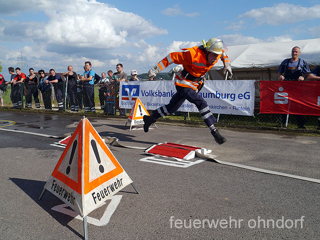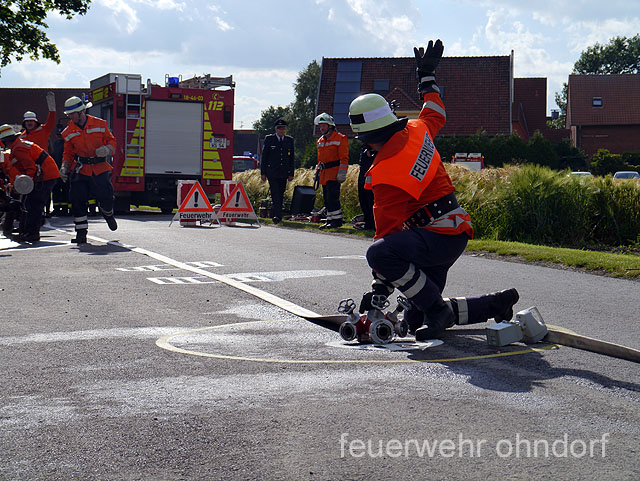 Anlässlich ihres 80-jährigen Bestehens lud die Freiwillige Feuerwehr Ohndorf befreundete Wehren aus dem Landkreis Schaumburg und der Region Hannover zu Wettbewerben ein. Insgesamt 33 Gruppen nahmen an den historischen „Eimerspielen“ und den Wettbewerben nach aktuell gültigen Bestimmungen teil. Am ersten Wettbewerbstag gingen 22 Gruppen an den Start. In den Wettbewerben nach alten Bestimmungen – den sogenannten Eimerspielen – galt es, so schnell wie möglich einen Löschangriff vorzunehmen. Die Feuerwehrleute in der Gruppe mussten nach dem Startsignal des Gruppenführers zunächst die Wasserversorgung aufbauen und dann drei Rohre vornehmen. Mit dem Abspritzen der „Eimer“ endete die Übung. Ein Wettkampfgericht aus der Samtgemeinde Nenndorf, unter der Leitung von Wilfried Lockemann, stoppte die Zeiten und notierte die Fehlerpunkte.Nach Abschluss des Wettbewerbs nahm Ortsbrandmeister Heinz-Konrad Stemme die Siegerehrung vor. Die erste Gruppe der Feuerwehr Hohenrode erreichte den ersten Platz. Sie benötigte lediglich 65 Sekunden, um den Löschangriff vorzunehmen. Platz zwei belegte mit 66,1 Sekunden die erste Gruppe der Feuerwehr Heuerßen, gefolgt von der Feuerwehr Groß Hegesdorf mit 68,3 Sekunden. Platz vier ging an die Feuerwehr Rannenberg und Platz fünf an die zweite Gruppe aus Heuerßen. Jedes gestartete Team erhielt neben einer Urkunde zusätzlich eine große Jagdwurst überreicht. Die ersten fünf Gruppen freuten sich zusätzlich über große Pokale. Elf Gruppen nahmen einen Tag später an den Wettbewerben nach den aktuellen Bestimmungen teil. Innerhalb von zehn Minuten muss hier ebenfalls ein Löschangriff vorgenommen werden. Dabei kommt es vor allen Dingen auf das Einhalten der Dienst- und Unfallverhütungsvorschriften an. Ein Wertungsteam unter der Leitung von Joachim Muth aus Sachsenhagen notierte die einzelnen Fehler und stoppte die Zeiten. Leider spielte das Wetter nicht immer mit. Besonders erwischte es das Team aus Hattendorf, das die Übung während eines heftigen Regenschauers absolvieren musste. Allerdings ließen sich die Männer und Frauen nicht beirren und führten die Übung normal durch. Auch das Wertungsteam blieb trotz durchnässter Uniformen auf der Bahn. Am Ende belegten die Hattendorfer Platz sieben. Die Siegerehrung nahm wieder Heinz-Konrad Stemme vor. Den ersten Platz holte die zweite Gruppe der Feuerwehr Schoholtensen/Altenhagen. Mit 408,98 Punkten verwiesen sie die Gruppe aus Sachsenhagen (395,44 Punkte) auf Platz zwei. Den dritten Platz belegte die erste Gruppe aus Schoholtensen/Altenhagen (387,72 Punkte). Alle teilnehmenden Gruppen erhielten mit der Urkunde einen Getränkegutschein überreicht. Zusätzlich erhielten die drei ersten Teams Pokale für das heimische Trophäenregal. Anlass für die Wettbewerbe war das 80-jährige Bestehen der Freiwilligen Feuerwehr Ohndorf. Seit 1934 sorgen Ohndorfer Männer und Frauen für den Brandschutz in und um Ohndorf. Uwe Blume, Leiter des Brandschutzabschnitts Nord im Landkreis Schaumburg, überbrachte die Grüße der Kreisfeuerwehr. Gleichzeitig gratulierte er der Feuerwehr Ohndorf zu Jubiläum. Er hob besonders die jahrelange verlässliche Zugehörigkeit zur Kreisfeuerwehrbereitschaft und das Engagement in der Jugendarbeit hervor. Text und Fotos: Marco Thiele | 13./14.06.2014
