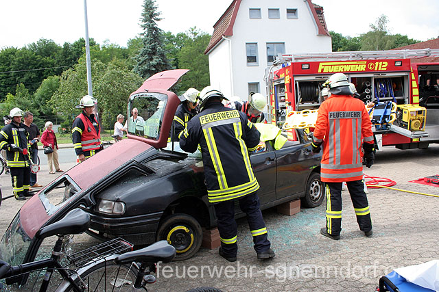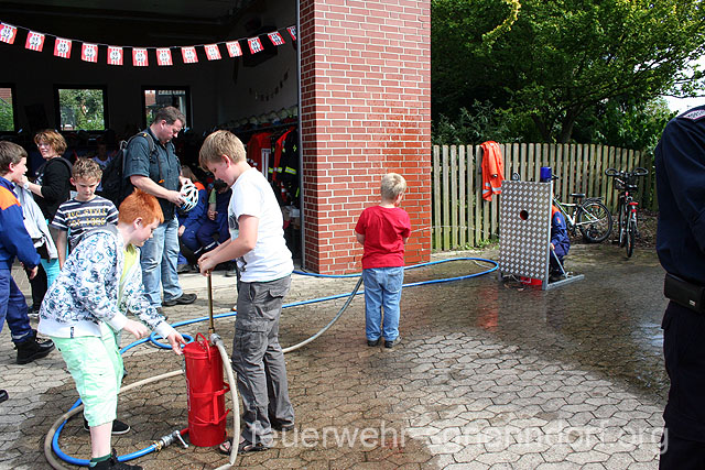 Anlässlich ihres 100-jährigen Bestehens lud die Freiwillige Feuerwehr Haste alle Bürgerinnen und Bürger zu einem Tag der offenen Tür in das Feuerwehrhaus an der Hauptstraße ein. Die Ehrenamtlichen rund um Ortsbrandmeister Klaus-Peter Wegener hatten sich viel für die Besucher einfallen lassen. Bei bestem Wetter fanden sich zahleiche Haster ein, um sich über die Feuerwehr zu informieren oder einfach nur bei Kaffee und Kuchen den schönen Tag zu genießen.Auf einem Parkplatz in der Nähe des Feuerwehrhauses waren Feuerwehrfahrzeuge jeglicher Art zu bestaunen. Eine Drehleiter der Feuerwehr Wunstorf, ein Logistik-Fahrzeug aus Stadthagen oder ein riesiges Löschfahrzeug der Flughafenfeuerwehr in Achum. Letzteres fand besondere Beachtung. Zum einen wegen seiner Dimensionen. 1.000 PS Motorleistung sorgen für einen schnellen Vortrieb und 460 PS Pumpenleistung sorgen für eine enorme Reichweite des eingebauten Wasserwerfers. Diese Reichweite demonstrierte das Fahrzeug gleich mehrfach. Auf reges Interesse stießen auch die liebevoll restaurierten Feuerwehr-Oldtimer. Löschfahrzeuge der Neuzeit und aus den 50ern demonstrierten anschaulich, welchen technischen Wandel es in den letzten Jahrzehnten auch bei den Feuerwehren gegeben hat. Rückten die Feuerwehren früher noch überwiegend zu Bränden aus, so sind es heute Hilfeleistungen und Verkehrsunfälle. Seit einigen Jahren verfügt auch die Wehr in Haste über einen sogenannten Hilfeleistungssatz. Mit diesem ist es möglich, bei Verkehrsunfällen eingeklemmte Personen aus Fahrzeugen zu befreien. Wie dieses durchgeführt wird, demonstrierten die Einsatzkräfte mit einer Rettungsübung. Mit hydraulischen Rettungsgeräten wurde ein altes Auto zerlegt. Unter anderem entfernten die Feuerwehrleute das Dach, um das „Opfer“ aus dem Fahrzeug zu befreien. Jeder Schritt der Rettung wurde fachmännisch und verständlich kommentiert. Die Kinder- und Jugendfeuerwehr war natürlich ebenfalls präsent. Die jüngsten Besucher konnten malen, spielen oder sich im Zielspritzen versuchen. Bei dem warmen Wetter war die Kübelspritze natürlich eine große Attraktion. Insgesamt freute sich die Feuerwehr über den guten Besuch und das Interesse der Haster Bevölkerung. Die Gäste verbrachten einen angenehmen Nachmittag und nahmen viele interessante Informationen mit nach Hause. Text: Marco Thiele | Fotos: Feuerwehr Haste