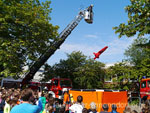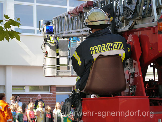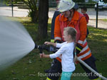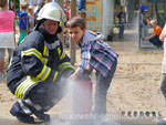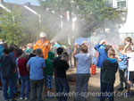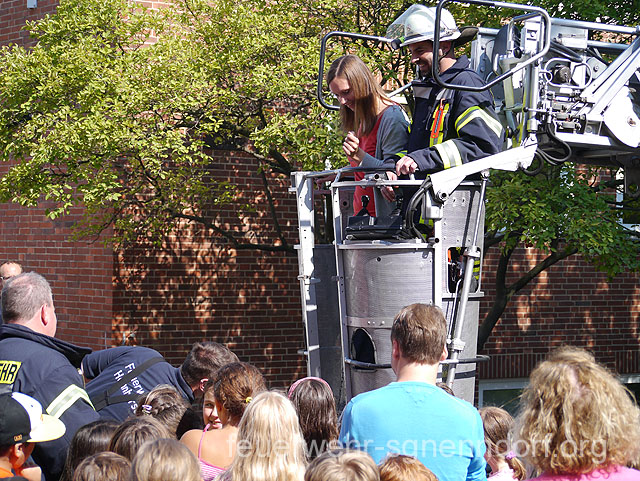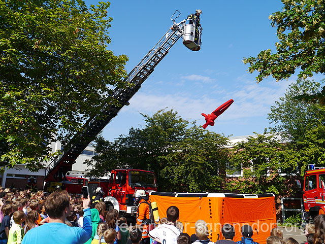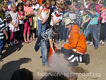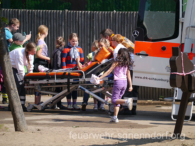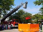 Große Aufregung herrschte unter den Schülern der Berlin-Schule in Bad Nenndorf, als morgens der Feueralarm ertönte. Er war aber nicht das Signal für einen Brand, sondern für den Beginn des Feuerwehr-Projekttages. Dieser wurde nach 2010 zum zweiten Mal in der Grundschule durchgeführt. ![]() Zunächst erlebten die Kinder eine Menschenrettung. Zwei Feuerwehrleute stiegen im Obergeschoss aus dem Fenster eines Klassenzimmers in den Korb der Drehleiter. Innerhalb weniger Augenblicke setzte sie der Maschinist der sicher auf dem Schulhof ab. Mithilfe eines Dummys demonstrierten die Feuerwehrleute anschließend die Nutzung eines Sprungretters. Dieses große Luftkissen ermöglicht es, aus größeren Höhen sicher den Boden zu erreichen. Unter großem Applaus flog der Dummy gleich mehrfach aus dem Korb der Drehleiter. Für Kinder und Lehrer gab es dann viel zu entdecken. An mehreren Stationen konnten die Kinder alle Fahrzeuge genau in Augenschein nehmen. Sie übten sich im Zielspritzen oder dem Löschen eines echten Feuers mit Feuerlöschern. Besonders beliebt waren natürlich die Stationen, an denen mit Wasser gearbeitet wurden. Angesichts der warmen Witterung war es auch kein Problem, wenn die eine oder andere Hose einmal nass wurde. Der Hochleistungslüfter, der normalweise genutzt wird, um Rauch aus einem Gebäude zu befördern, diente an diesem Tag einmal als großer Fön. Gruppenweise stellten sich die Kinder vor das große Gebläse und ließen sich die Sommerluft um die Beine pusten. Den Lehrern spendierte die Feuerwehr Bad Nenndorf eine Besichtigung des Schulgebäudes von oben. Auch wenn sich die eine oder andere Lehrkraft etwas mulmig fühlte, spätestens nach den Anfeuerungsrufen der Schüler fuhr sie dann doch mit der Drehleiter in luftige Höhen. Die Kinder nahmen derweil die Fahrzeuge genauestens unter die Lupe. Der Rettungswagen des Deutschen Roten Kreuzes war sehr gefragt, durften sich die Kleinen doch einmal auf der Liege ausstrecken. Bei der Feuerwehr Haste war Probesitzen im Fahrzeug angesagt. Ob hinter dem Lenkrad oder im Mannschaftsraum war letztlich egal. Ein Junge fragte, ob er die Tür schließen dürfte. Auf die Frage, weshalb, antwortete er: „Dann fühlt’s sich echter an.“ Die Jungen und Mädchen der Berlin-Schule waren begeistert. Die Lehrer hatten zum Ende der Aktion sichtlich Mühe, ihre Schüler wieder in die Klassenräume zu bekommen. Die Nenndorfer Feuerwehren verfolgen mit dem Projekttag mehrere Ziele. Zum einen konnten sie sich davon überzeugen, wie die Räumung der Schule bei Feueralarm abläuft. Zum anderen diente der Projekttag natürlich auch der Nachwuchsgewinnung. Noch sind die Feuerwehren mit einer ausreichenden Personaldecke ausgestattet. Doch die demographische Entwicklung macht auch vor den ehrenamtlichen Brandschützern nicht halt. In Zukunft ist nach Angaben des Niedersächsischen Innenministeriums mit einem Rückgang der aktiven Einsatzkräfte zu rechnen. Eine intensive Jugendarbeit ist eine der Maßnahmen, die hier gegensteuern soll. In der Samtgemeinde Nenndorf gibt es derzeit neun Jugendfeuerwehren und acht Kinderfeuerwehren. Dieser Projekttag, der im nächsten Jahr an der Grundschule Haste wiederholt wird, soll bei den Kindern das Interesse für die Kinder- und Jugendfeuerwehren wecken. Jedes Kind bekam als Gedächtnisstütze einen Flyer überreicht. Neue Mitglieder, natürlich auch in den Einsatzabteilungen, sind herzlich willkommen. An Vorbereitung und Durchführung des Projekttages haben unter der Leitung von Brandschutzerzieher Frank Schröder mehr als 40 ehrenamtliche Helfer mitgewirkt. Teilweise nahmen sie hierfür extra Urlaub. Auf dem Hof waren insgesamt 14 Einsatzfahrzeuge, vom Einsatzleitwagen und der Drehleiter, über den Rettungswagen bis hin zum Tanklöschfahrzeug. Text und Fotos: Marco Thiele | 27.06.2014