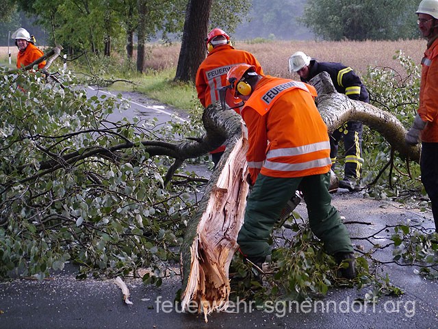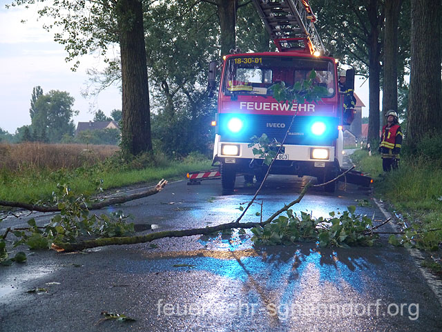 Ein Gewitter mit heftigen Böen ließ in der nördlichen Samtgemeinde Nenndorf mehrere Bäume und größere Aste auf Straßen stürzen. Betroffen waren Haste und die Landesstraße zwischen Rehren und Ottensen, welche komplett blockiert war. In Haste ließ der kurze aber heftige Gewittersturm zwei Bäume umstürzen. Einer davon traf eine Straßenlaterne und beschädigte diese. Die Feuerwehr Haste entfernte die Bäume und sicherte die Laterne bis zum Eintreffen eines Elektrikers.Die L449 zwischen Rehren und Ottensen wurde durch große von den Pappeln herabgestürzte Äste blockiert. Laub und zahlreiche kleinere Äste lagen zusätzlich auf der Fahrbahn. Die Feuerwehren aus Rehren und Hohnhorst beseitigten die Hindernisse mit mehreren Motorsägen und einem Traktor. Da noch weitere halb abgerissene Äste in den Bäumen hingen, wurde die Feuerwehr Bad Nenndorf mit der Drehleiter hinzugerufen. Mit einer Bügelsäge trennten die Einsatzkräfte schließlich die Äste ab, sodass sie keine Gefahr mehr bedeuteten. Insgesamt waren vier Feuerwehren mit 35 Feuerwehrleuten und sechs Fahrzeugen im Einsatz. Text und Fotos: Marco Thiele | 10.07.2014