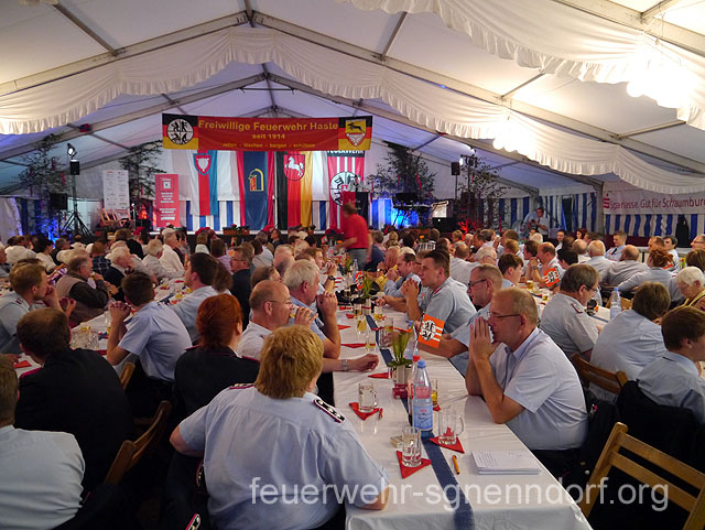 1914 gründeten vorausschauende Bürger die Freiwillige Feuerwehr Haste. Dieses besondere Jubiläum nahm die Feuerwehr zum Anlass, um mit den Haster Einwohnern und befreundeten Feuerwehren ausgiebig zu feiern. Schon das ganze Jahr finden verschiedene Veranstaltungen zum Feuerwehrjubiläum statt. Den Auftakt machte ein Fußballturnier in der Sporthalle. Es folgten weitere Aktionen wie einer Ausstellung im Bürgerhaus, einem Tag der offenen Tür oder Feuerwehrwettbewerben.Als Höhepunkt der Feierlichkeiten fand nun im Zelt auf dem Festplatz ein Kommers statt. Zahlreiche Freunde der Feuerwehr nutzen die Gelegenheit, zum 100. Jubiläum zu gratulieren. Die weiteste Anreise hatte eine Schweizer Trachtengruppe aus Küssnacht am Rigi, zu der Haste seit 20 Jahren eine freundschaftliche Beziehung führt. Mit Alphörnern und Trachtentanz sorgten sie mit für einen Feuerwehr-Kommers der etwas anderen Art. Durch die kurzweilige Veranstaltung führten die Haster Jens und Margit Gümmer. Schlagfertig und humorvoll moderierten Sie die mehr als dreistündige Feier. Zahlreiche Gäste aus Politik und Feuerwehr, unter ihnen Landrat Jörg Farr und Kreisbrandmeister Klaus-Peter Grote, überbrachten den ehrenamtlichen Feuerwehrleuten ihre Glückwünsche. Sie lobten deren seit vielen Jahrzehnten andauerndes Engagement für ihre Mitbürger. Das Motto der Feuerwehren „Retten, Löschen, Bergen, Schützen“ stand hierbei immer wieder im Mittelpunkt der Ansprachen. Es wurde aber auch kritische Töne laut, indem für eine zeitgemäße technische Ausstattung geworben wurde. Nur mit adäquaten Mitteln können die Feuerwehrleute ihre Aufgaben erfüllen. Pastor Gero Cochlovius baute sein Grußwort jedoch auf die bekannten Töne des Martinshorns auf: „Tatü Tata“. Cochlovius, der auch als Notfallseelsorger tätig ist, interpretierte die Silben aus seiner Sicht. Und aus der seiner Tochter, die beim Anblick eines Feuerwehrautos immer „Tü-Tata“ sagte. Die erste Silbe steht somit für „tüchtig“. Die zweite für „tatkräftig“ und die letzte schließlich für „tapfer“. So hat der Pastor in den Jahren seines Amtes in der Gemeinde die Feuerwehren erlebt. Der ehemalige Ortsbrandmeister Klaus-Peter Wegener ließ in seiner Ansprache die Geschichte der Feuerwehr Revue passieren. Von der Anschaffung der ersten Feuerspritze, der Gründung einer Damenfeuerwehr im 2. Weltkrieg, der Anschaffung eines Löschfahrzeuges bis zur Gründung der Jugend- und Kinderfeuerwehr wurden alle wichtigen Ereignisse angesprochen. Immer wieder ergänzt durch Anekdoten aus 100 Jahren Feuerwehr. Kreisbrandmeister Klaus-Peter Grote ehrte Wegener im Anschluss für sein Jahrzehnte währendes Engagement in der Feuerwehr Haste, der Gemeindefeuerwehr und der Kreisfeuerwehr mit dem Deutschen Feuerwehr-Ehrenkreuz in Bronze. Sichtlich überrascht und gerührt nahm Klaus-Peter Wegener die Ehrung entgegen. Mit einem Medley bekannter Schlager, live gesungen von Margit Gümmer, neigte sich die Veranstaltung dem Ende entgegen. Nach dem offiziellen Schlusswort des Ortsbrandmeisters Carsten Norden feierten die Besucher noch einige Zeit ausgelassen weiter. Text und Fotos: Marco Thiele