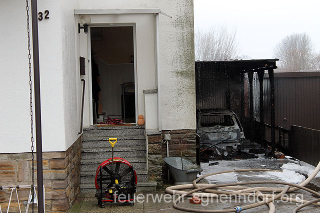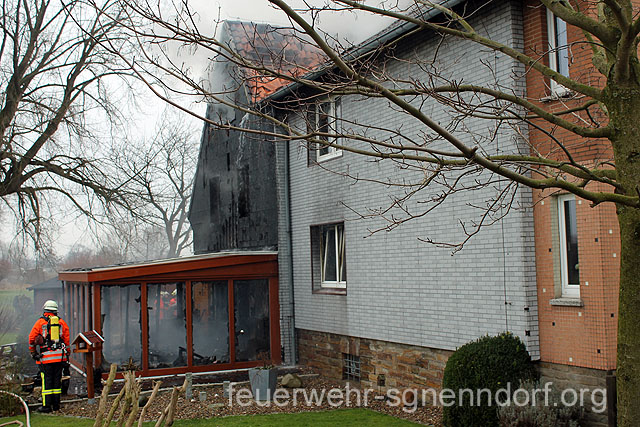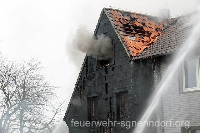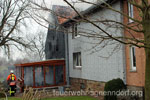 Mit dem Stichwort "Feuer Wohnhaus" wurden am Samstagvormittag zahlreiche Feuerwehren aus der Samtgemeinde Nenndorf in die Ohndorfer Kapellenstraße alarmiert. Beim Eintreffen der ersten Kräfte fanden Sie einen brennenden Pkw unter einem Carport vor. Das Feuer hatte bereits auf das Wohnhaus und ein Nachbargebäude übergegriffen. ![]() Von der Nord- und Westseite wurden weitere B- und C-Rohre zur Brandbekämpfung eingesetzt. Trupps unter Atemschutz gingen in das Gebäude vor, mussten den Einsatz jedoch immer wieder unterbrechen, da Einsturzgefahr bestand. Die Drehleiter aus Bad Nenndorf bekämpfte derweil das Feuer im Dachstuhl. Allerdings fiel die Drehleiter aufgrund eines technischen Defekts aus. Daher rückte die Feuerwehr Stadthagen mit der Hubrettungsbühne an. Aus dem Korb heraus entfernten die Einsatzkräfte die Dachziegel, um das Feuer gezielt bekämpfen zu können. Als Wasserentnahmestelle diente die Rodenberger Aue, die direkt am Wohnhaus vorbei floss. Mit zwei Tragkraftspritzen stellten die Feuerwehren genügend Wasser für die Brandbekämpfung bereit. Nach etwa fünf Stunden war das Feuer gelöscht. Um das Wiederaufflammen des Brandes zu vermeiden, wurde das Gebäude mit Schaum abgedeckt. Noch in den ersten Minuten des Einsatzes begannen Nachbarn damit, Kaffee und Brühe für die Einsatzkräfte zu kochen und an die Einsatzstelle zu bringen. Die Feuerwehr Helsinghausen/Kreuzriehe hatte ein Zelt aufgebaut, in dem sich die Feuerwehrleute aufwärmen konnten. Für die Verpflegung sorgte die Feuerwehr Riehe, die in Haste Kaltgetränke und etwas zu essen organisierte. Während der Löscharbeiten kam es zu einem Unfall. Durch einen geplatzten Schlauch wurde ein Mitarbeiter des Rettungsdienstes im Gesicht verletzt. Seine Kollegen versorgten ihn und brachten ihn ins Krankenhaus. Weitere Personen wurden nicht verletzt. Die betroffenen Bewohner des Hauses, eine fünfköpfige Familie und zwei Mieter, haben nahezu ihr gesamtes Hab und Gut verloren. Sie kamen zunächst bei Nachbarn unter. Der Samtgemeindebürgermeister Mike Schmidt war ebenfalls mehrere Stunden vor Ort. Er machte sich ein Bild vom Einsatz der Feuerwehren und stellte sicher, dass die Bewohner versorgt sind. Ein Ohndorfer Bürger stellte der Familie zudem sein zum Verkauf stehendes und derzeit leeres Haus zur Verfügung. Während der am Abend stattfindenden Jahreshauptversammlung der Feuerwehr Ohndorf sammelten die Feuerwehrleute Geld für die betroffene Familie. Die drei Kinder sind alle Mitglieder der Jugendfeuerwehr. Auch die betroffenen Mieter sind oder waren Mitglieder der Ohndorfer Feuerwehr. Im Einsatz waren die Feuerwehren Bad Nenndorf, Haste, Helsinghausen/Kreuzriehe, Hohnhorst, Horsten, Ohndorf, Rehren, Riehe, Riepen und Stadthagen. Dazu kamen der Rettungsdienst, der später durch zwei Rettungswagen des DRK-Einsatzzuges abgelöst wurde. Ferner waren die Polizei, die Straßenmeisterei und Mitarbeiter des Landkreises vor Ort. Insgesamt waren mehr als 100 Kräfte mit etwa 20 Fahrzeugen bei diesem Feuer im Einsatz. Gegen 16:00 Uhr verließ das Fahrzeug der Feuerwehr Ohndorf als letztes die Einsatzstelle. Text: Marco Thiele | Fotos: Sven Geist, Kreisfeuerwehr, Team Presse