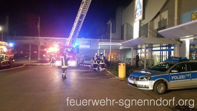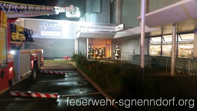 Dass die Alarmierung der Feuerwehr durch eine Brandmeldeanlage nicht immer ein Fehlalarm sein muss, zeigte ein Einsatz in Waltringhausen. Kurz nach 23 Uhr lief der Alarm aus dem Einkaufszentrum an der Piepmühle in Waltringhausen auf. Vor Ort fanden die Feuerwehrleute mehrere verqualmte Geschäfte vor. ![]() Im Einsatz waren die Feuerwehren des Löschzugs Ost sowie die Ortsfeuerwehr Bad Nenndorf. Mehrere Trupps unter Atemschutz löschten das entstandene Feuer und suchten die Räumlichkeiten ab. Mit drei Lüftern beförderten die Feuerwehren den Rauch aus mehreren Geschäften wieder in Freie. Zusätzlich leuchteten sie die Einsatzstelle aus. Gegen 01:00 Uhr war der Einsatz für die Feuerwehr beendet. Die Polizei informiert mit einer Pressemitteilung ebenfalls über den Vorfall: Nienburg (ots) - BAD NENNDORF (mie) - In den späten Abendstunden des Montag, 23.11.15, sprengten bislang Unbekannte den Geldausgabeautomaten (GAA) des SB Center der Volksbank im Industriegebiet des Ortsteils Waltringhausen, Piepmühle, und erbeuteten Bargeld in noch unbekannter Höhe. Durch die Sprengung verursachten die Täter einen hohen Sachschaden am GAA und am Gebäude. Um 23.06 Uhr lief bei der Regionalleitstelle Süntel der Überfallalarm am GAA in dem SB Center der Volksbank auf. "Als die erste Streifenwagenbesatzung wenig später eintraf, war der Vorraum des Gebäudes völlig verqualmt, der GAA stand in Flammen und die Täter waren bereits geflüchtet", fasst Polizeisprecherin Gabriela Mielke zusammen. Das Feuer wurde durch die alarmierten Feuerwehren aus Waltringhausen, Bad Nenndorf und Kreuzriehe, die mit 45 Kräften im Einsatz waren, gelöscht. "Die Unbekannten hatten Gas in den GAA eingeleitet und gezündet", so Mielke. Durch die herbeigeführte Explosion wurde der GAA komplett zerstört. Die Täter flüchteten mit einer nicht feststehenden Summe Bargeld und hinterließen einen Sachschaden im mittleren fünfstelligen Bereich. Durch die Rauchentwicklung wurden auch die angrenzenden Geschäfte in Mitleidenschaft gezogen. Die Polizei Nienburg hofft auf Zeugen und fragt, wem verdächtige Personen oder Fahrzeuge aufgefallen sind. "So wurde in Tatortnähe ein silberner Skoda Fabia mit drei besetzten Personen beobachtet", ergänzt die Polizeisprecherin. Die Fahndung nach diesem Fahrzeug verlief negativ. Hinweise nehmen die Ermittler des Fachkommissariats 2 unter 05021/97780 entgegen. Text: Marco Thiele, Polizei | Fotos: Markus Brandt, Polizei