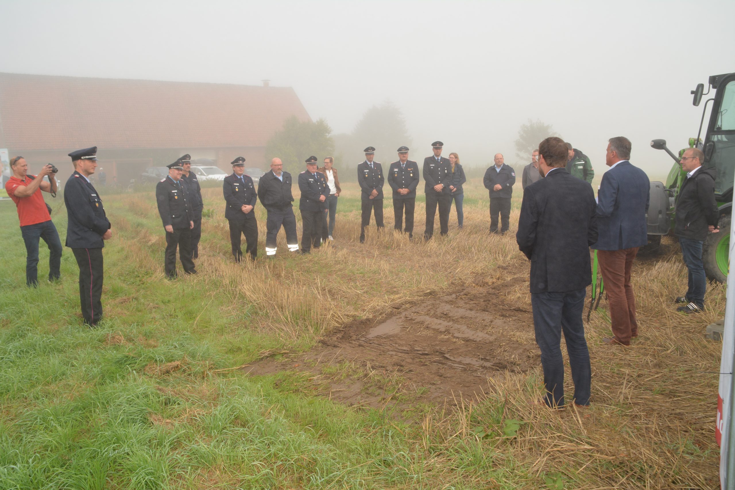 Auf dem neu erworbenen Grundstück am Ortseingang Hohnhorst trafen sich neben Samtgemeindebürgermeister Mike Schmidt auch die Ortsbrandmeister der Wehren Haste, Hohnhorst und Helsinghausen/ Kreuzriehe, sowie der Planer Uwe Brinkmann und die Gemeindebrandmeister der Samtgemeinde Nenndorf.